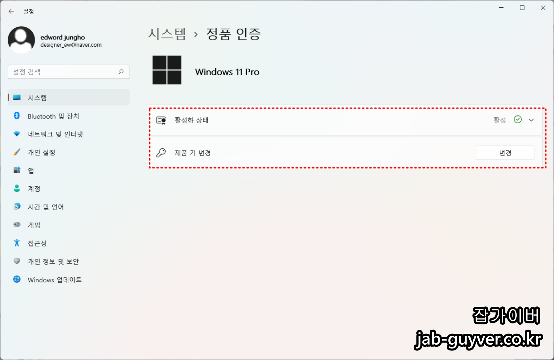 현재 저는 윈도우 제품키 등록되어 정품인증이 되어 있는 상태로 상위나 하위 윈도우 라이센스로 업그레이드 하고 싶다면 제품키 변경을 눌러줍니다.