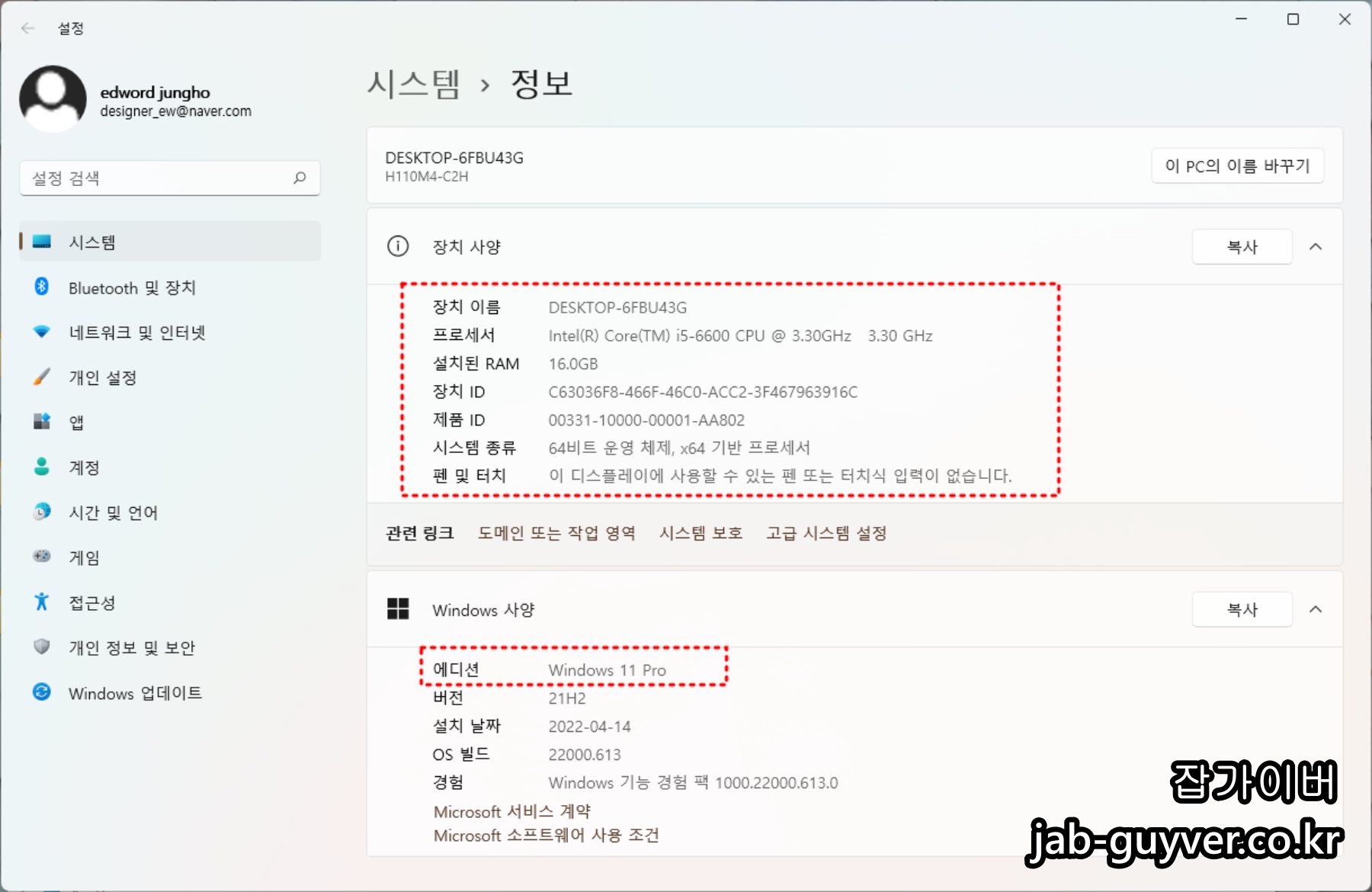 시스템 정보에는 현재 컴퓨터 사양 "PC이름, CPU 프로세서, 설치된 Ram, 장치ID, 제품ID, 윈도우32BIT / 64BIT. 윈도우 설치버전, 설치날짜"등이 표시됩니다.