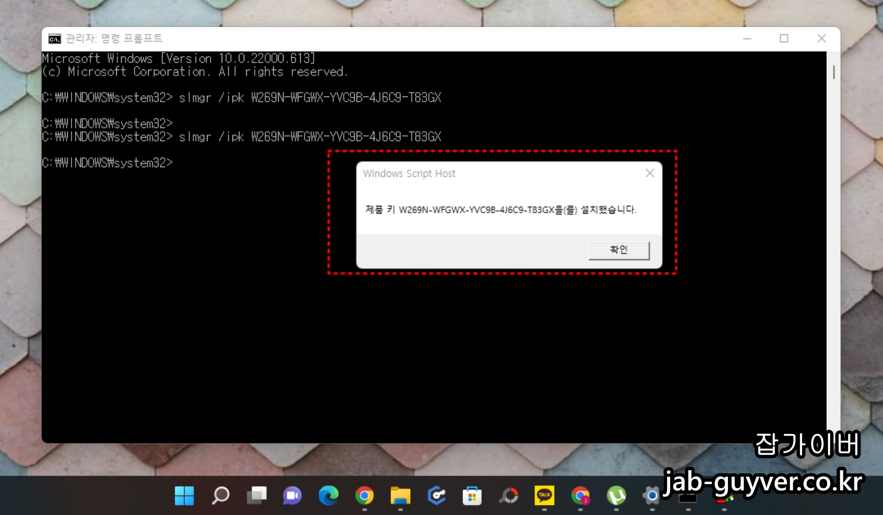 다음 위 명령어를 각각 입력하면 윈도우11 정품인증이 완료됩니다.