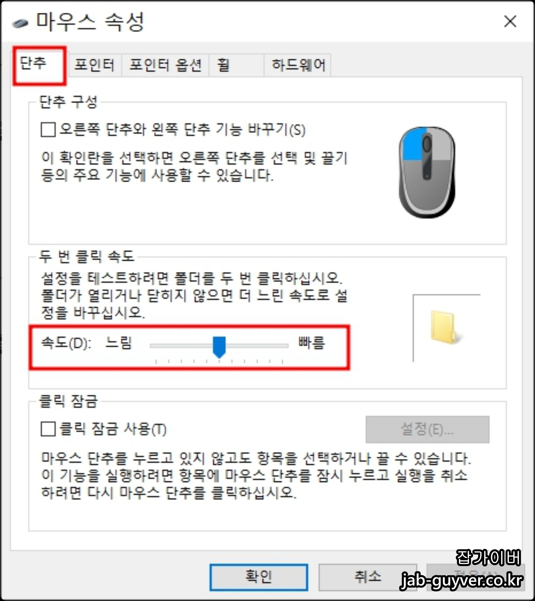 마우스 클릭시 버벅거림도 동일하게 마우스 이동속도와 클릭속도를 조절합니다.