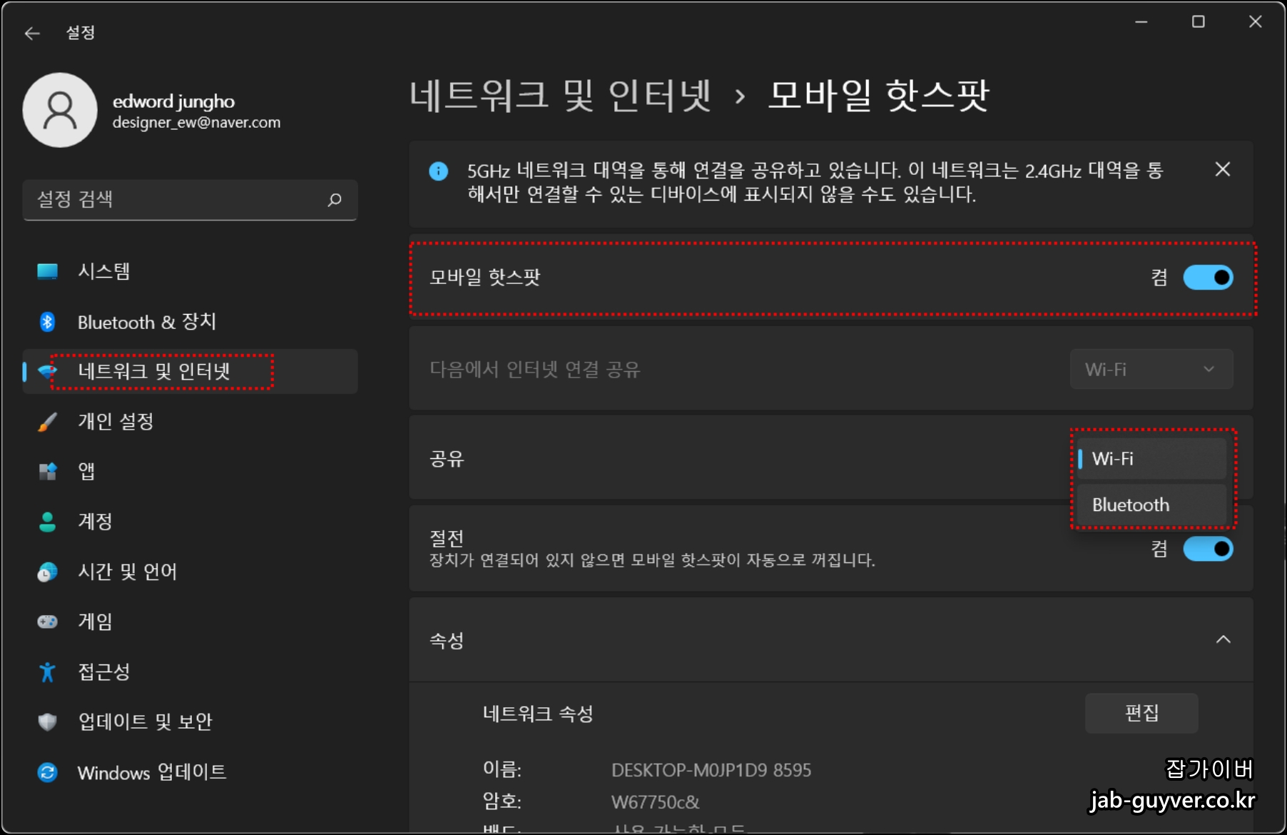 네트워크 및 인터넷에서 모바일 핫스팟을 끄거나 킬 수 있으며 노트북에 연결된 인터넷 연결을 공유기 허브처럼 사용해 모바일 핫스팟을 와이파이나 블루투스로 공유하도록 설정할 수 있습니다.