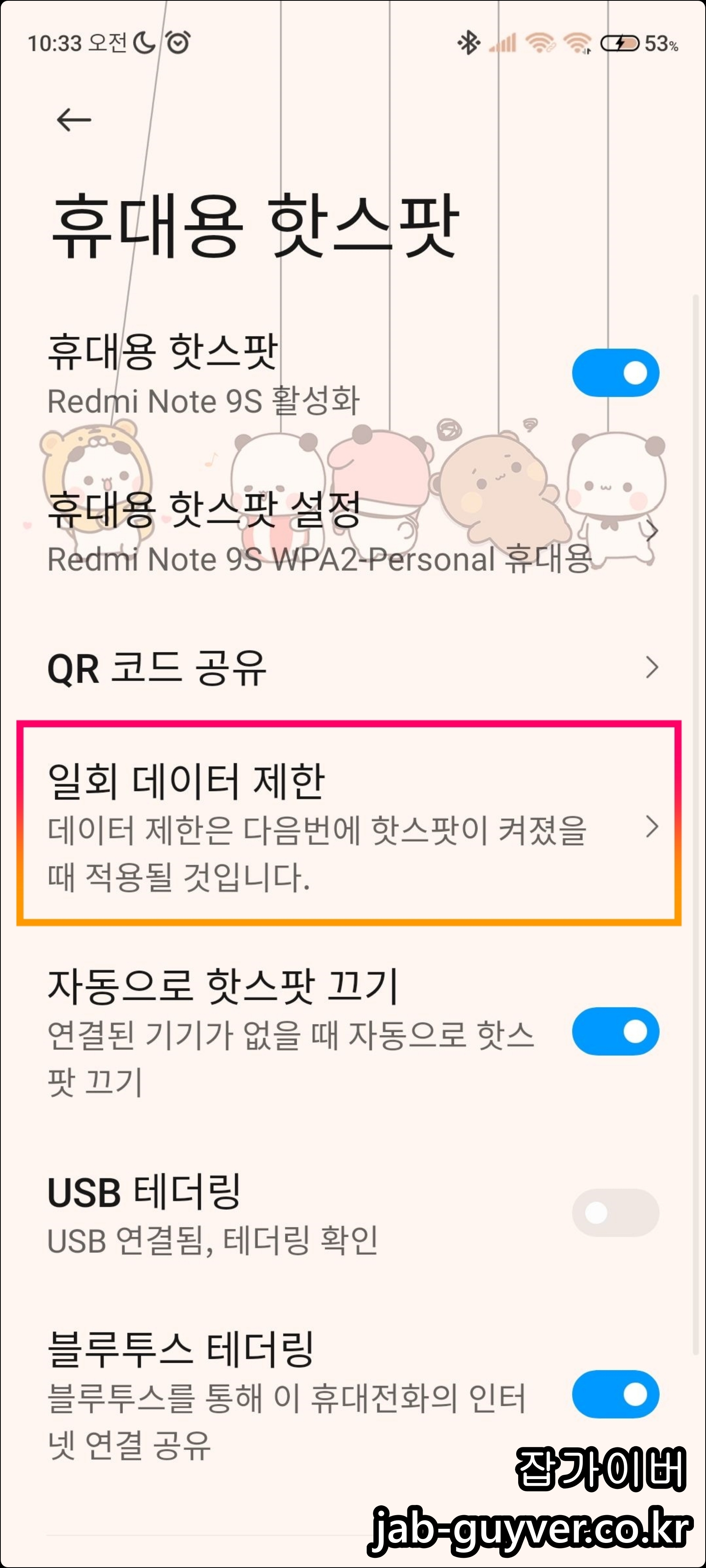 핸드폰 핫스팟을 통해 와이파이 테더링을 사용하게 되면 데이터 사용량이 모바일버전과 달리 노트북으로 접속 시 급히 모바일데이터가 소모될 수 있는데 이 경우 일일 데이터 제한을 통해 인터넷 사용량을 제합니다.