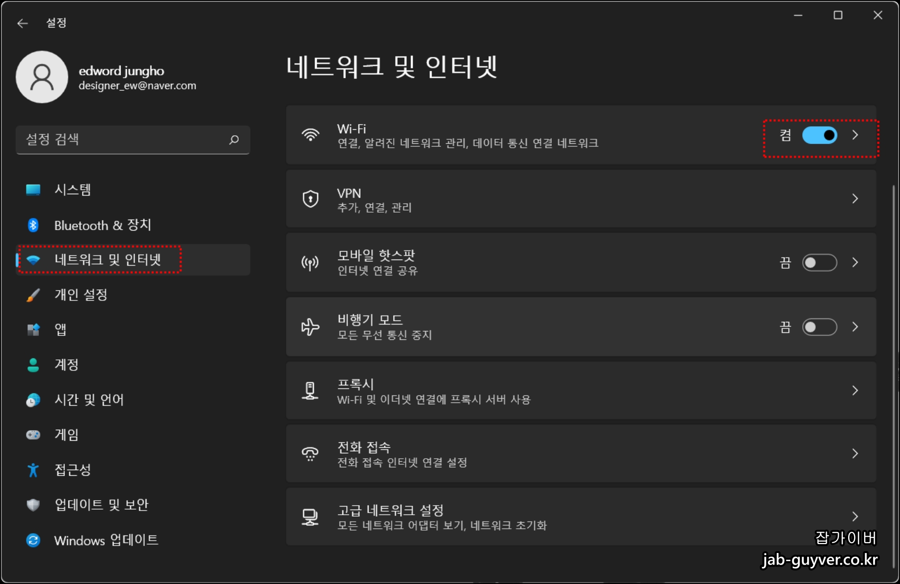 윈도우11 노트북 와이파이 및 핫스팟 연결