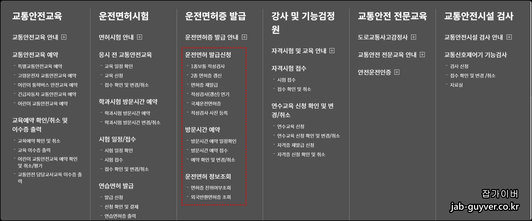 이 중에서 면허증 재발급 탭을 선택하며 해당신청은 핸드폰 모바일버전은 지원하지 않기 때문에 PC버전으로 접속해야 합니다.