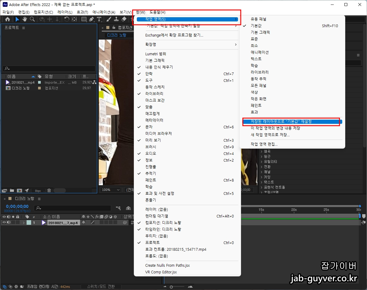 다른방법으로는 에프터이펙트 메뉴 중 상단 메뉴바에서 초기화가 가능합니다.