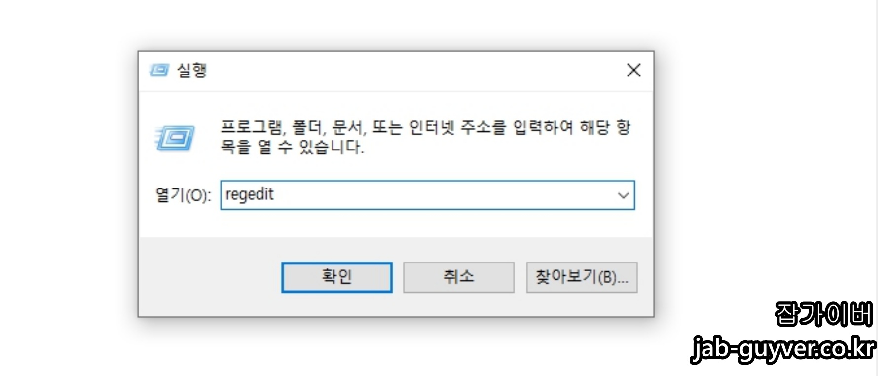 윈도우 키 + R → 실행창에 regedit 입력 → 확인 (레지스트리 편집기 실행)