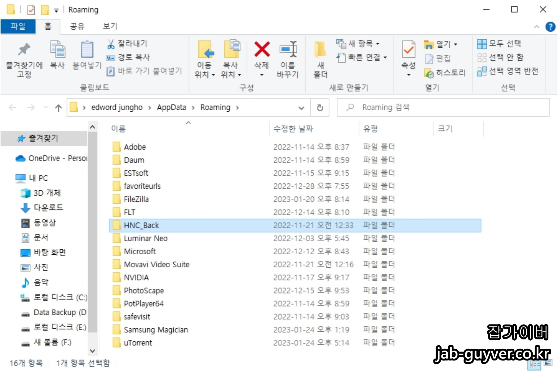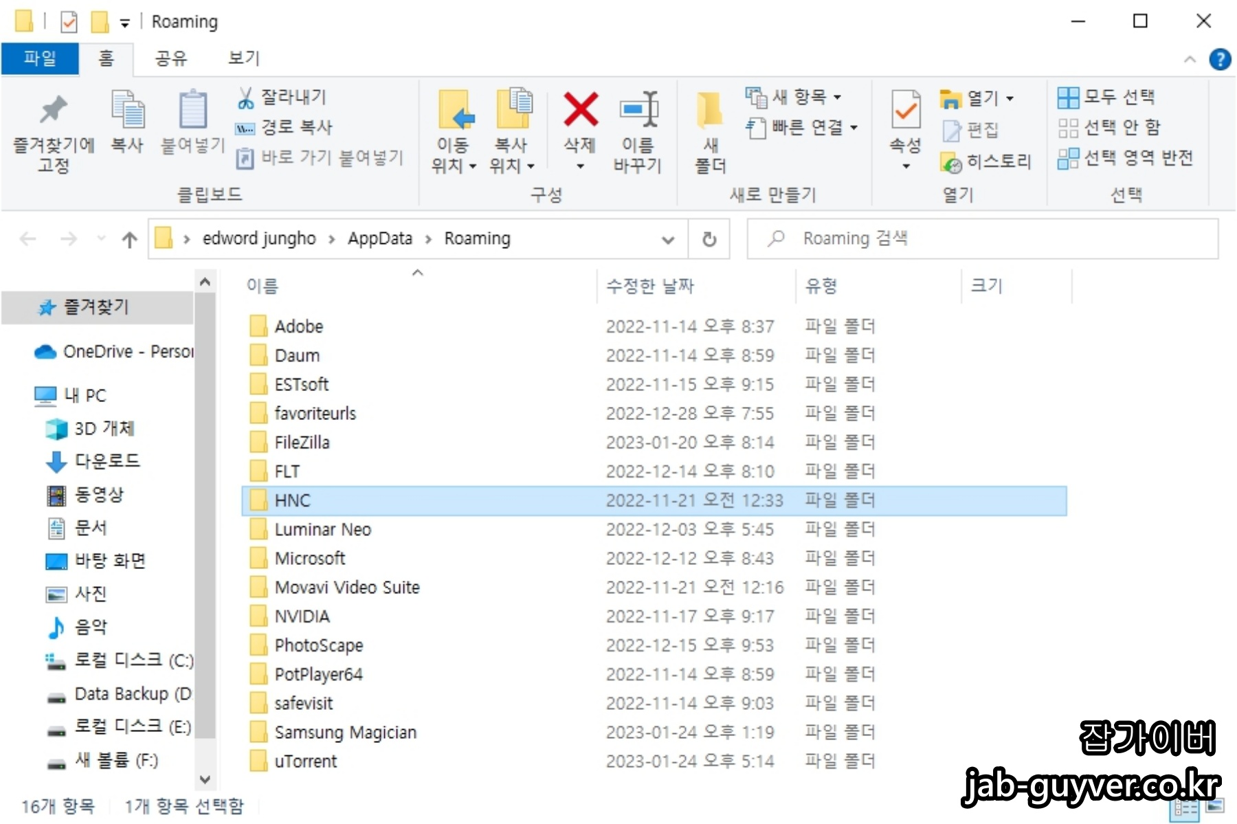 로밍 폴더에서 HNC 폴더가 설정/캐시를 들고 있는데, 여기가 꼬이면 한컴오피스가 멈추거나 자주 꺼질 수 있어요.
