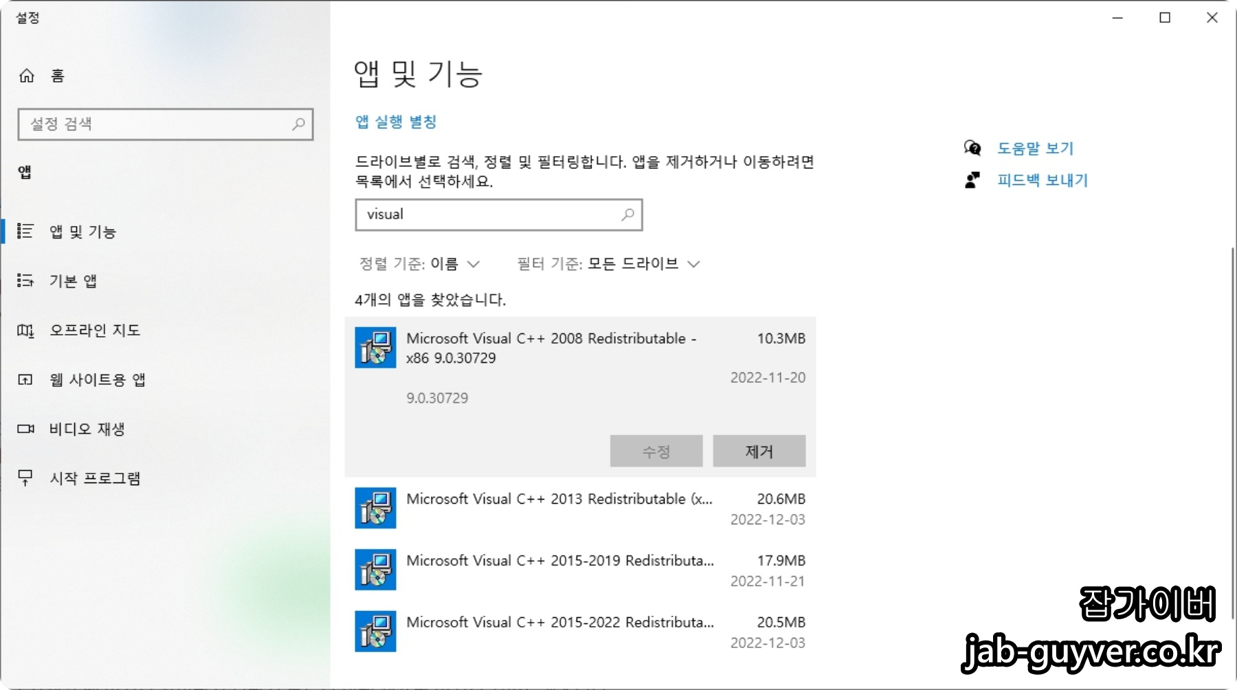 1) 앱 및 기능(프로그램 추가/제거)로 들어가서 2) 설치된 Microsoft Visual C++ 항목을 정리(삭제) 후 3) 필요한 런타임을 다시 설치합니다.