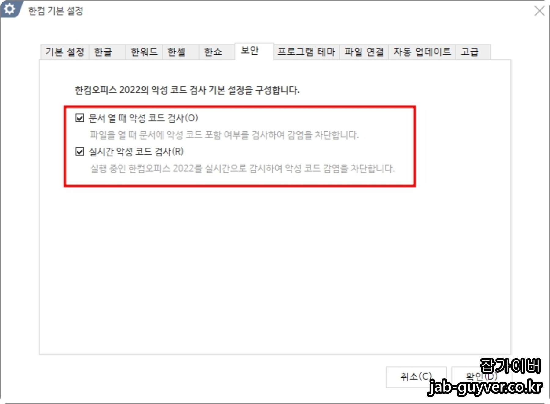 보안을 위해 문서 실행 시 악성코드 검사, 실시간 악성코드 검사 옵션도 필요에 따라 활성화해두면 좋습니다.