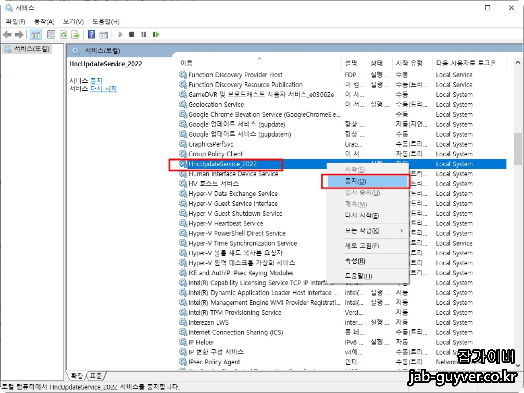 서비스 목록에서 HncUpdateService를 찾아 중지로 변경합니다.