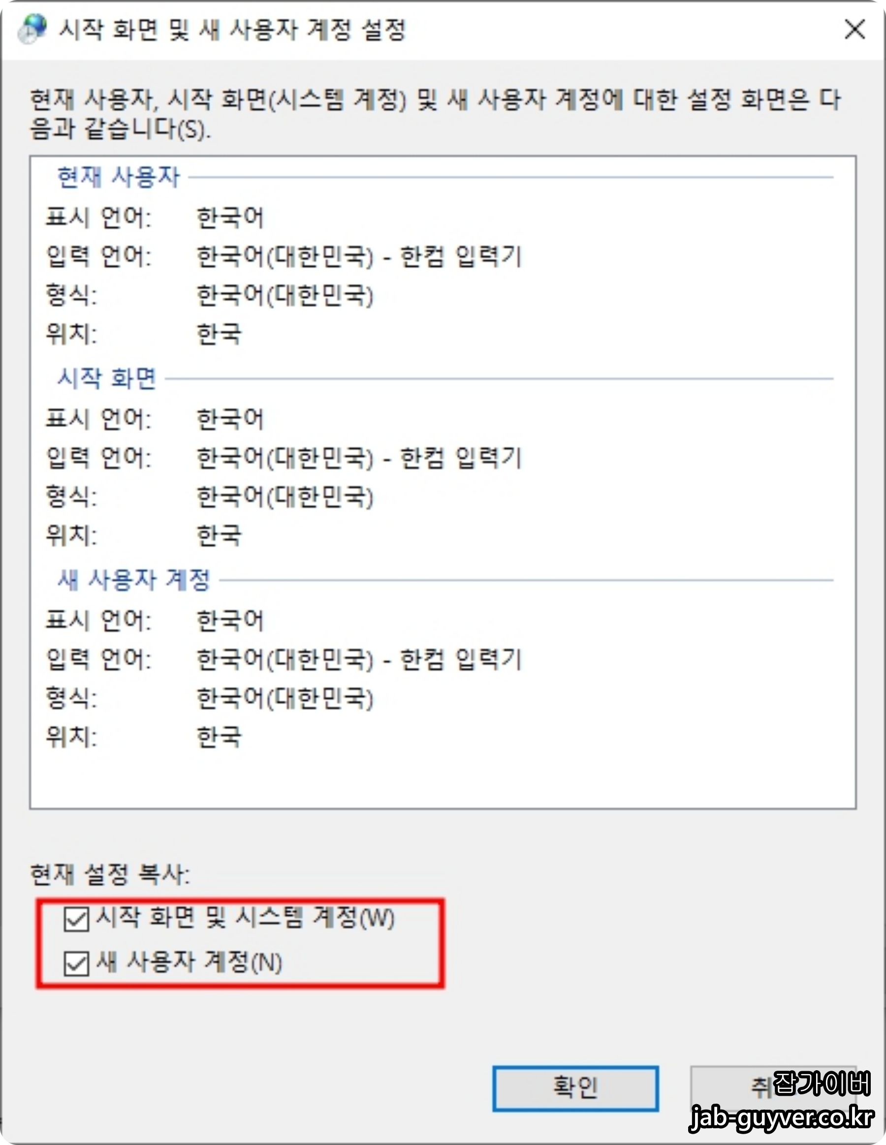 관리자옵션에서 시작화면 및 새 사용자 계정의 설정 복사 -> 현재 설정복사를 시작 화면 및 시스템 계정 과 새 사용자 계정을 체크해줍니다.