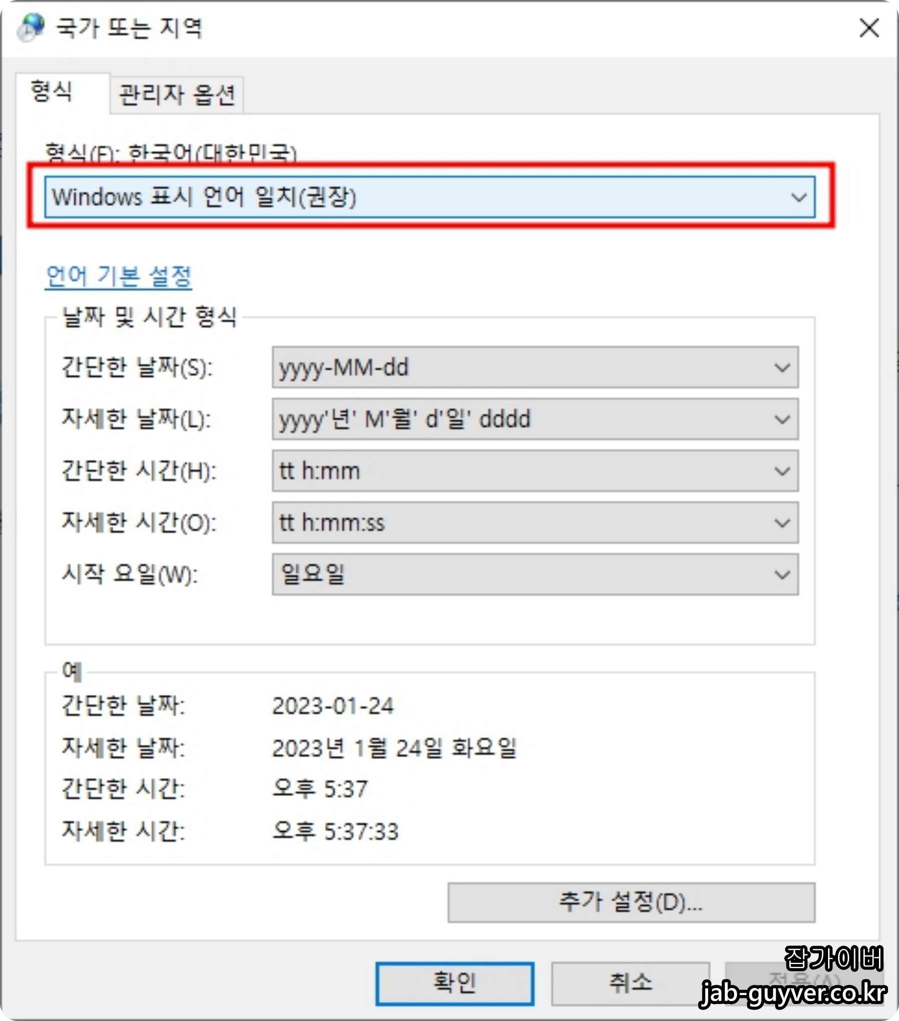Windows 표시언어 및 기본설정언어가 한국어로 되어 있는지 확인합니다.