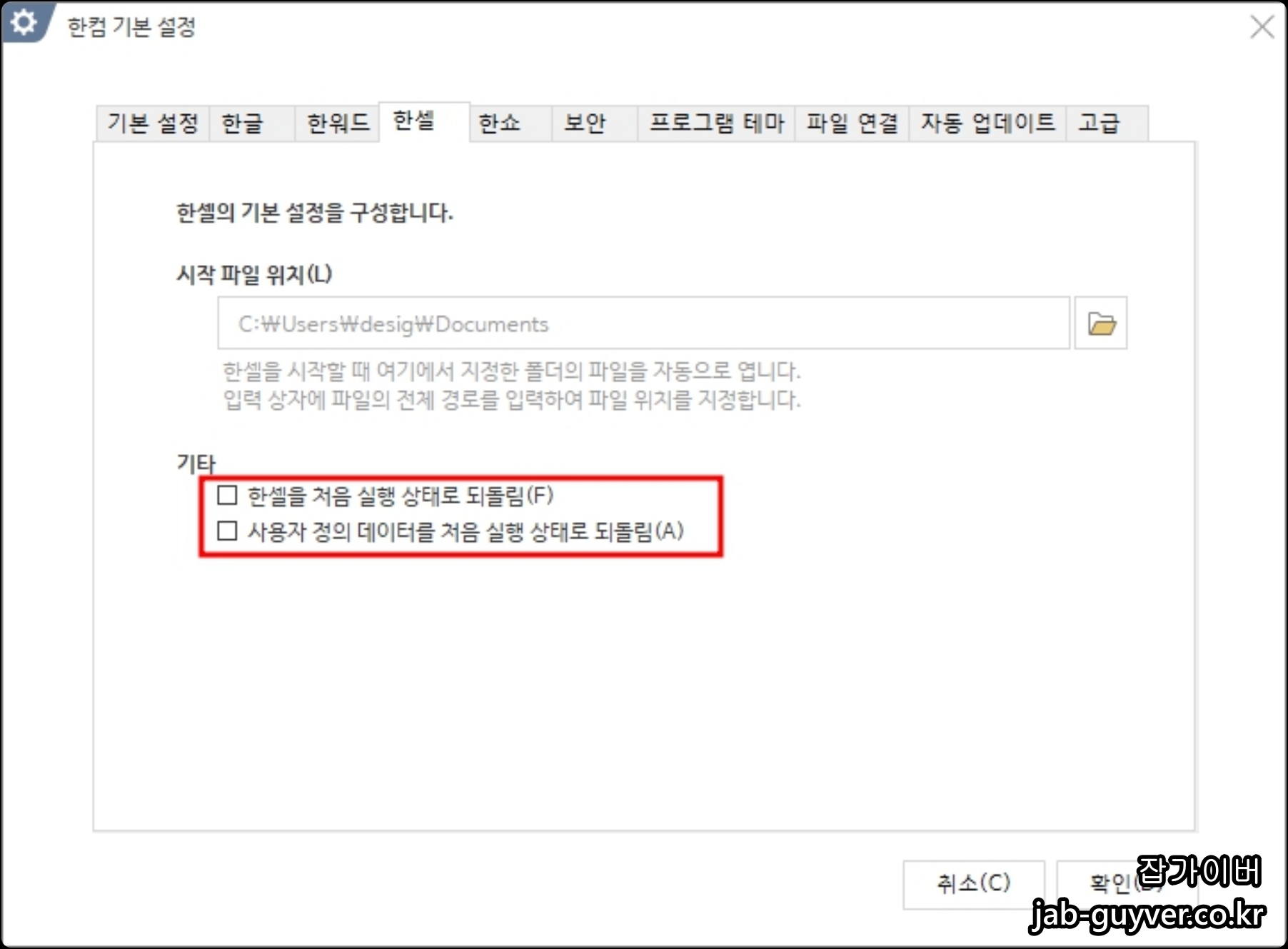 그 외 사용자 정의데이터를 처음상태로 되돌리거나 문서 시작파일의 경로를 지정해 자동을 파일을 실행할 수 있습니다.