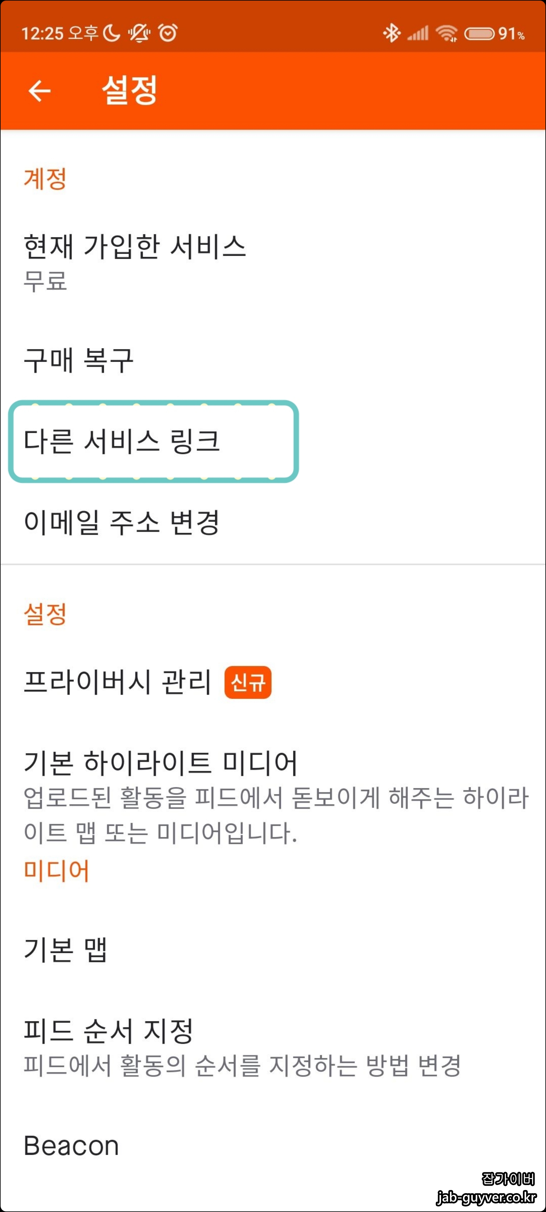 안드로이드 및 아이폰 등 스트라바 앱으로 실행 후 설정 -> 다른서비스 링크를 선택합니다.
