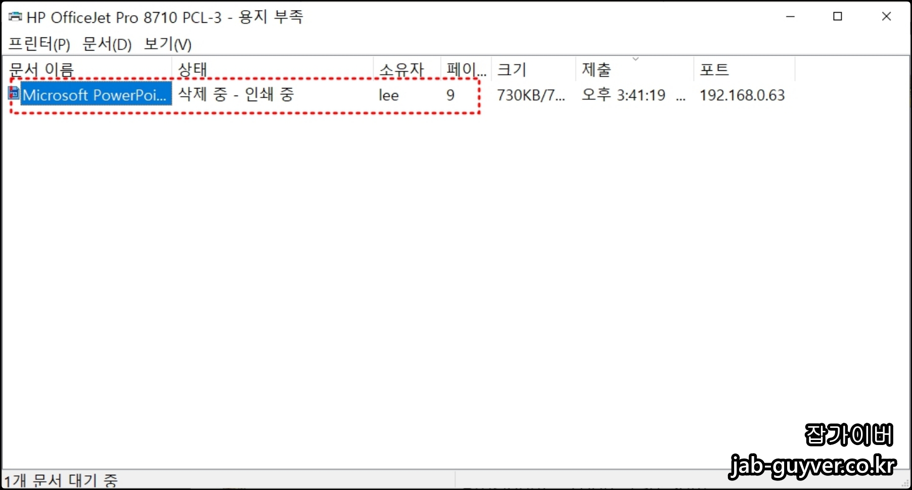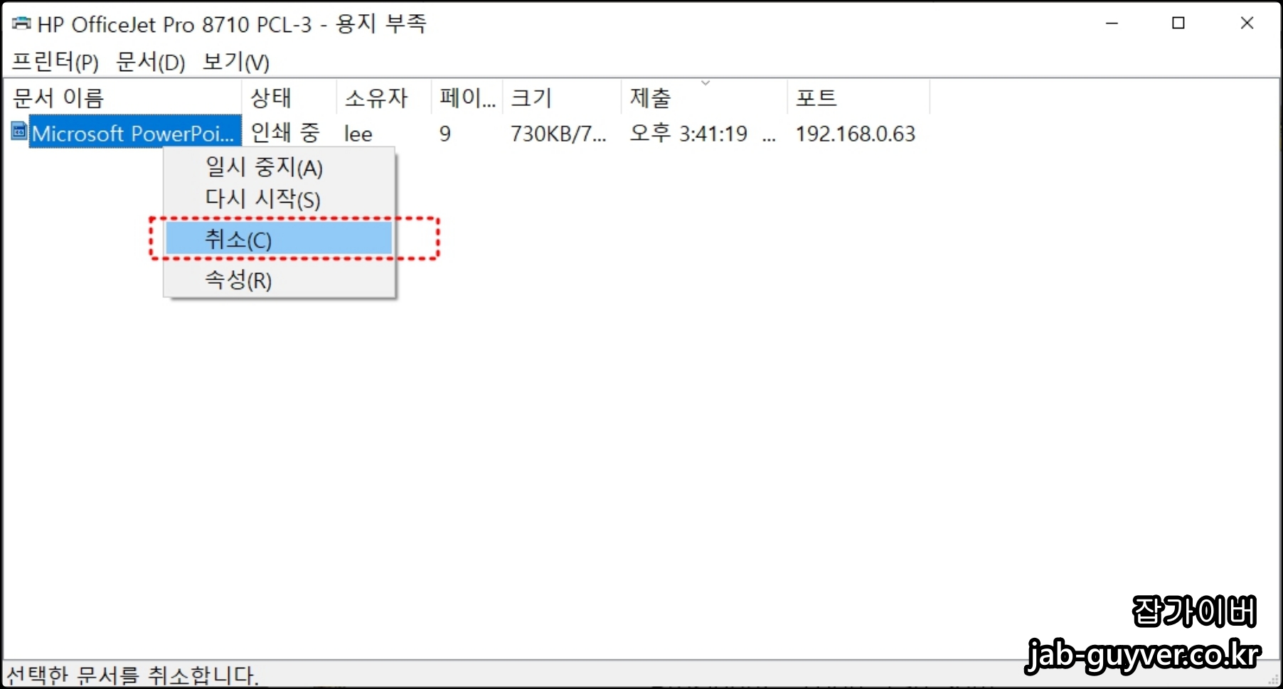 여러장 종이를 인쇄 중 종이가 계속 걸린다면 기존 대기중 인쇄 및 인쇄중 항목을 모두 삭제해서 초기화합니다.