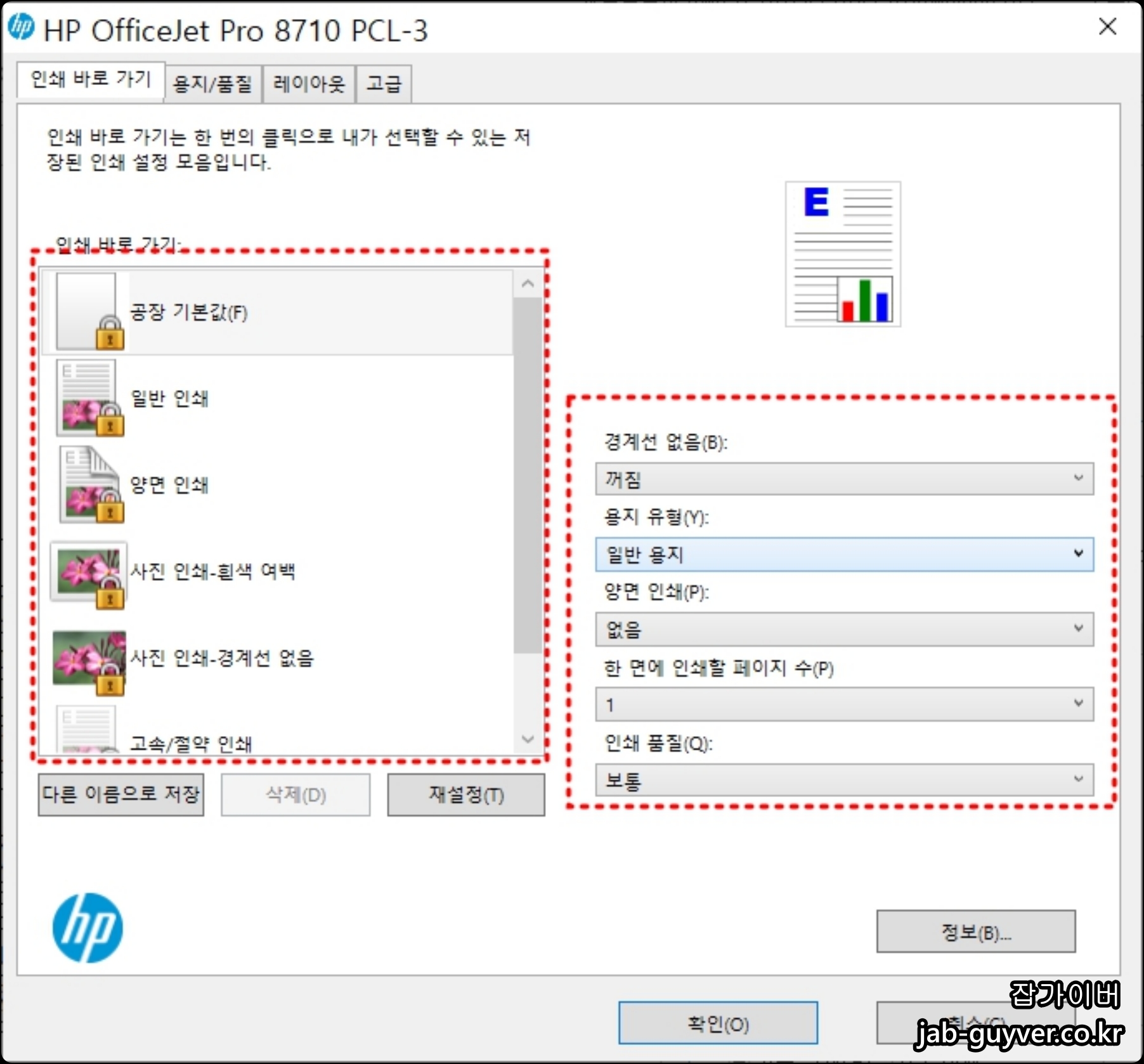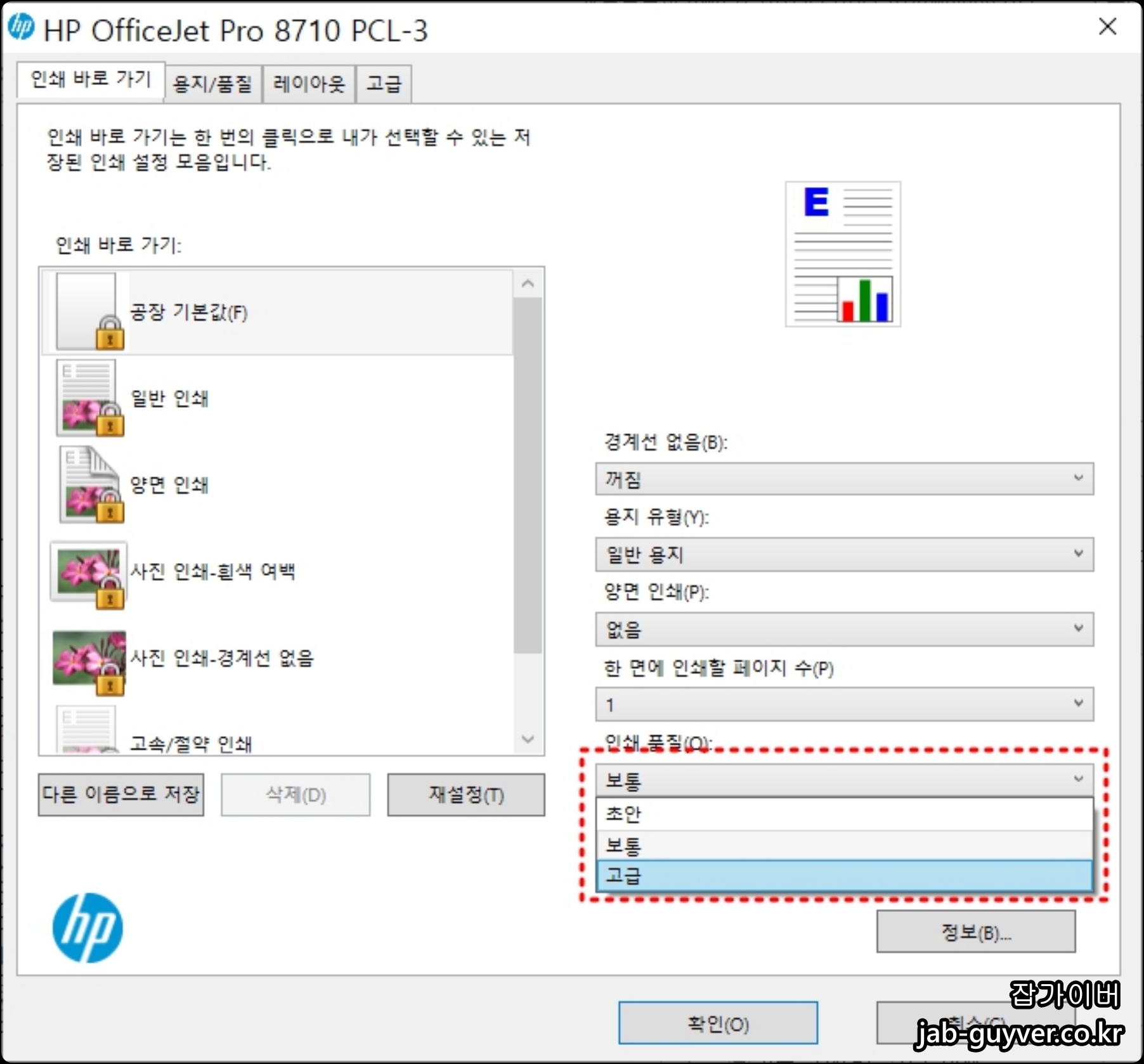 사진인화를 인한 포토용지 및 고급 코팅지를 사용한다면 용지유형에서 광택 잉크지나 두꺼운 일반용지, 매트한 프레젠테이션 용지등을 선택하고 인쇄품질동안 고급으로 변경합니다.
