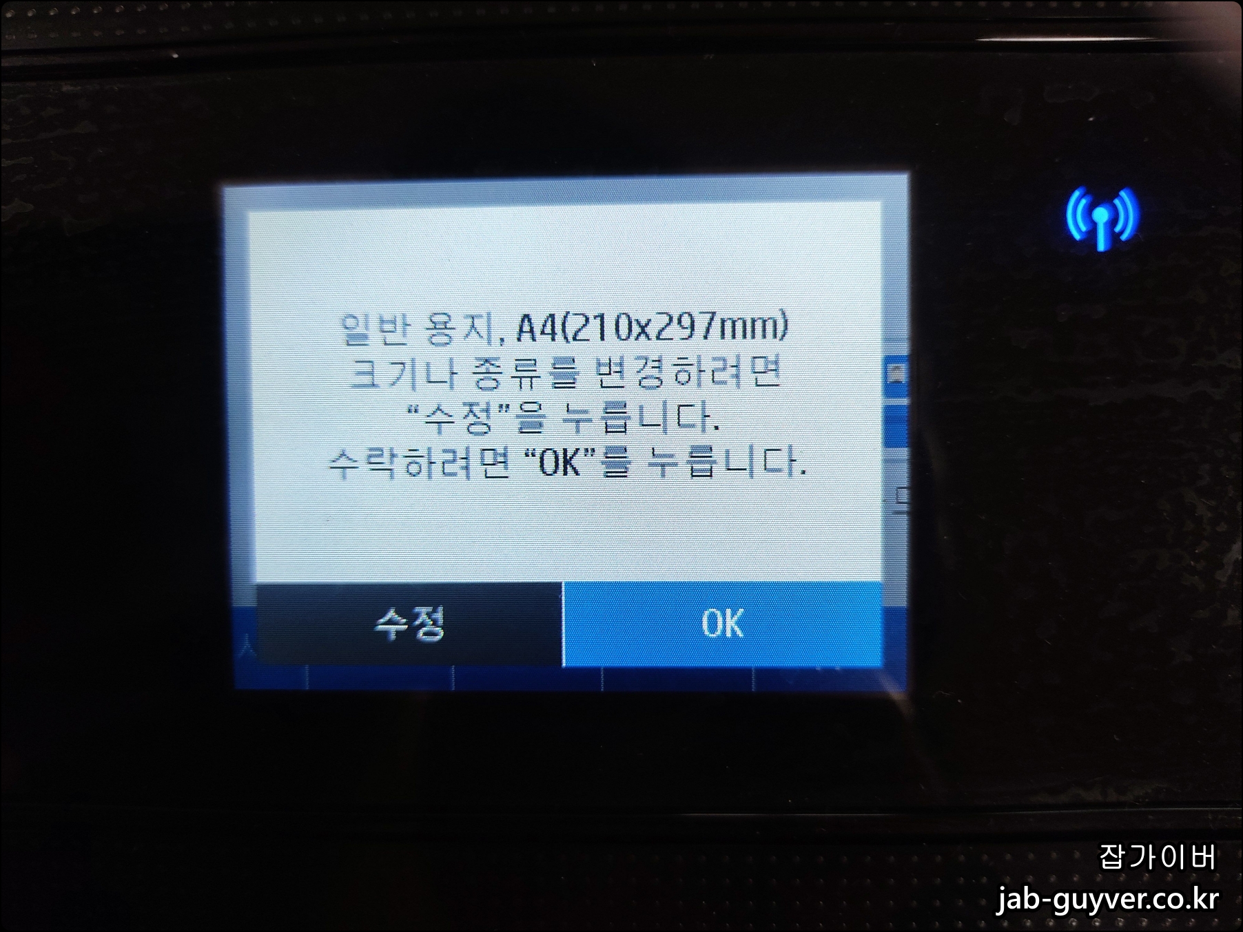 종이용지를 교체시에는 현재 사용하고 있는 요지크기를 A4, A3, A2, A1 등 설정이 맞게 변경되었는지 확인합니다.