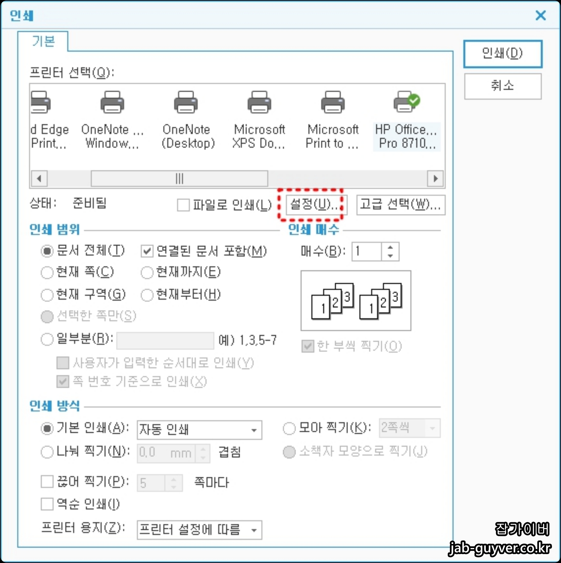 프린터 인쇄 설정에서 프린터용지 설정 및 품질을 변경할 수 있습니다.