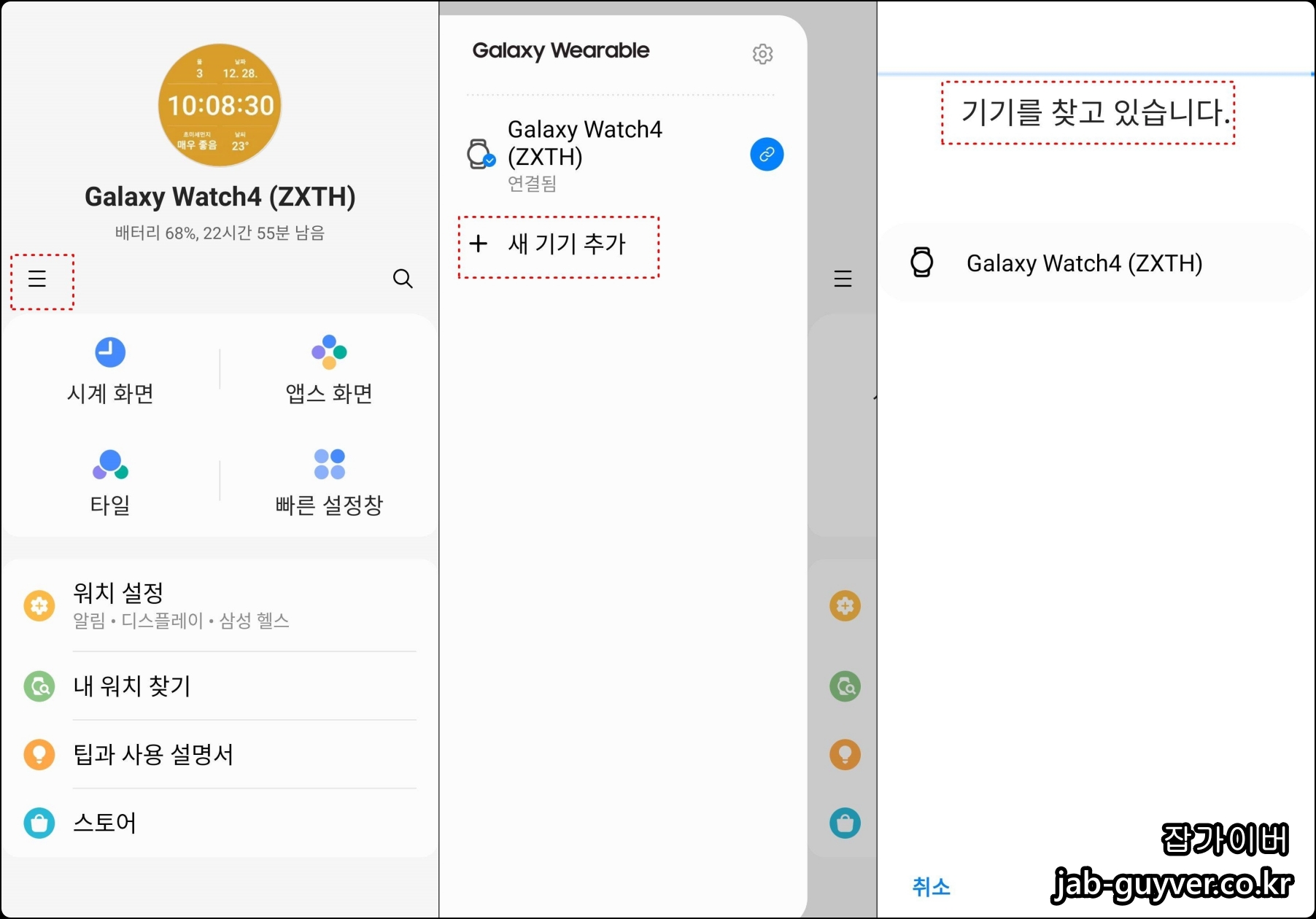 만약 아이폰과 갤럭시워치 연동이 실패한다면 기존에 갤럭시워치에 연동된 기기가 있는지 확인하고 새폰으로 연결을 통해 초기화 후 다시 아이폰과 연결합니다.