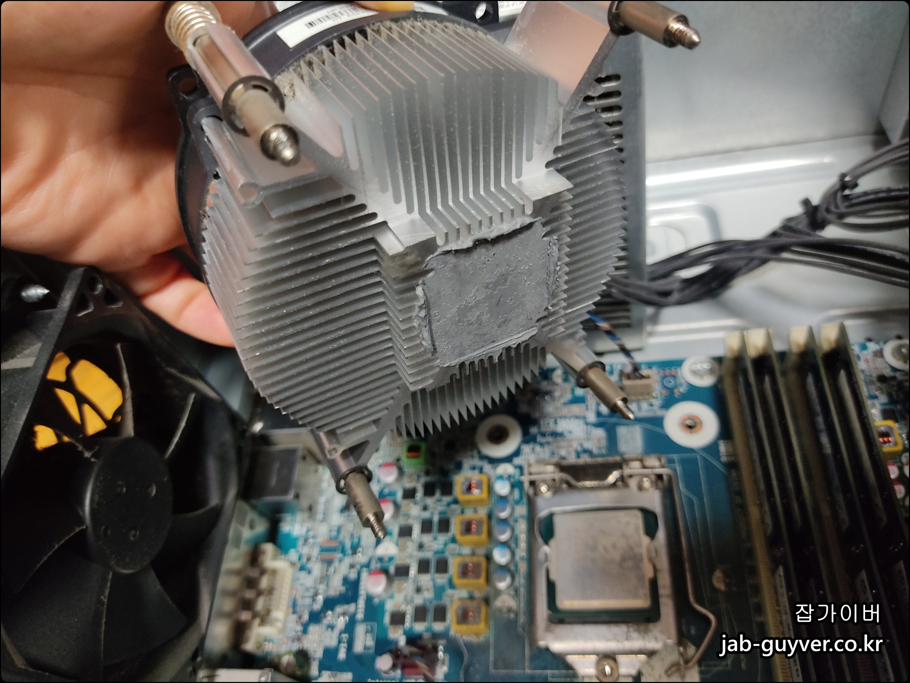 원래 저 CPU 써멀구리스가 있어야 하는데 5년넘게 사용하면서 구리스가 사라졌거나 아니면 처음 구입 후 조립할때부터 이미 구리스를 적게 발라둔것입니다.