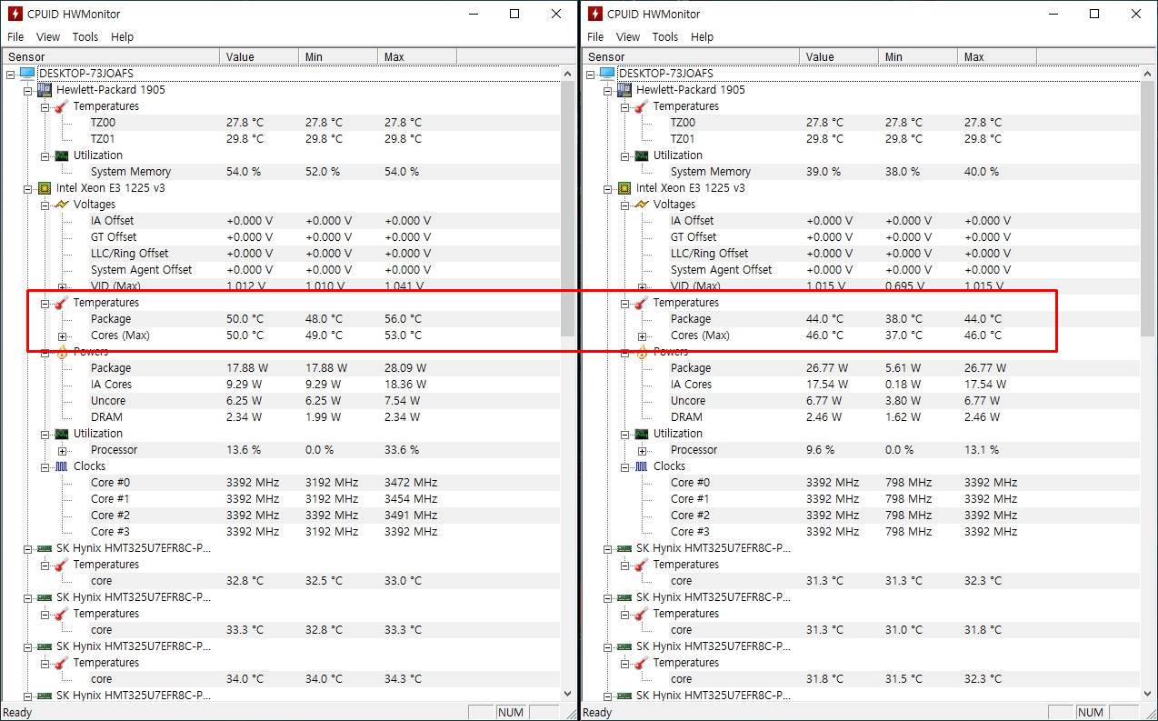 왼쪽은 써멀구리스를 바르기전 50도까지 올라가던 CPU 코어 온도가 바르고 난뒤 44도까지 떨어진것을 볼 수 있으며 아래로 내려보면 파워전력 또한 17W -> 26W로 상승되었습니다.