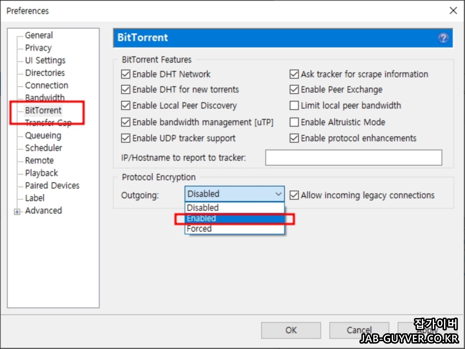 다음 BitTorrent 탭으로 이동 후 프로토콜 항목을 Enabled "허용"으로 체크합니다.