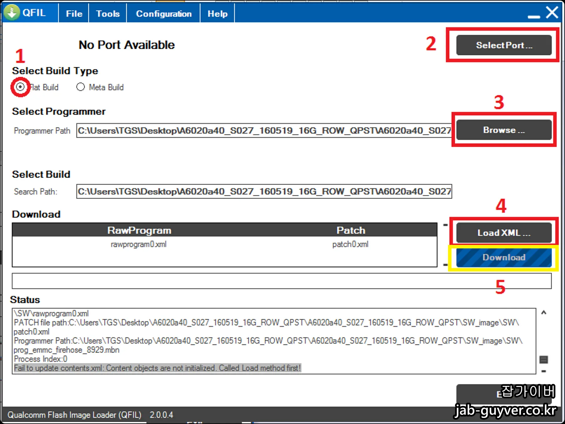 이는 주로 firmware 파일 구성 문제나 QFIL 설정 오류 때문입니다. rawprogram0.xml이 누락되었거나 경로 설정이 잘못된 경우이며, 해당 펌웨어를 다시 다운로드하거나 최신 버전 사용이 필요합니다.