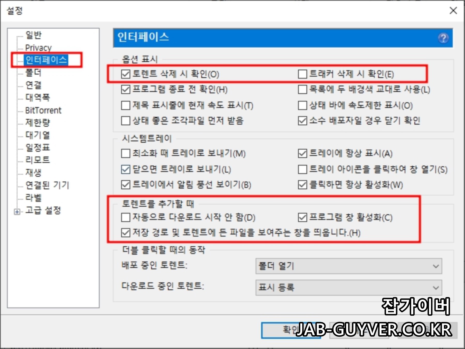 이후 설정에서 인터페이스 - 토렌트 트래커 삭제 시 확인을 추가합니다.