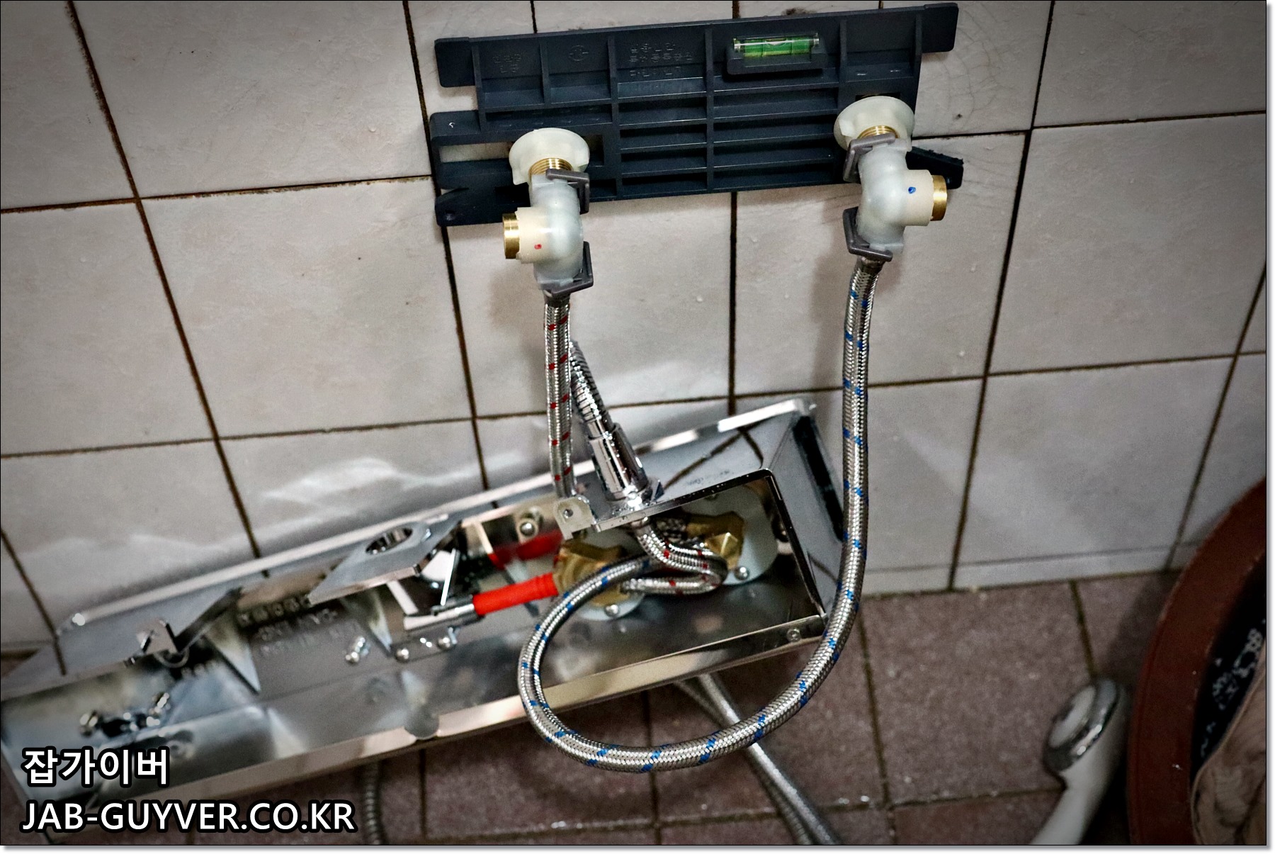 다음 샤워수전 안에 있는 호스를 각각 뜨거운물 차가운물 호스에 맞게 꼽아줍니다.