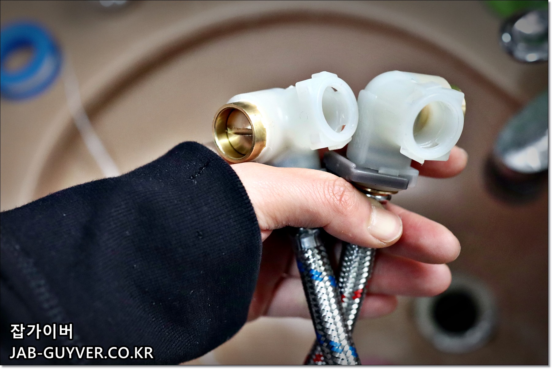 해당사진은 잘못되었는데 뜨거운물이 왼쪽 차가운물이 오른쪽인데 호스 연결 시에는 뜨거운물이 오