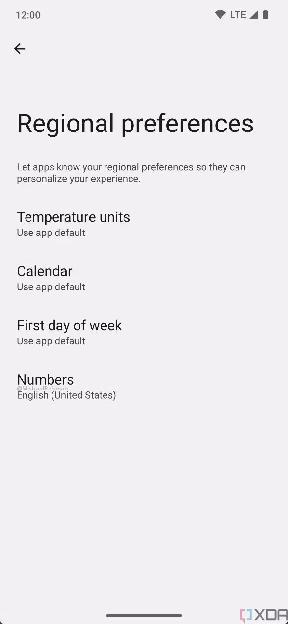 공식 발표 외에도, Mishaal Rahman은 지역 선호도라고 불리는 앱별 맞춤형 옵션을 몇 가지 더 발견했습니다. 이것들은 안드로이드14의 앱별 언어 옵션 바로 아래에 위치할 것이며, 장치와 번호 선호도를 설정할 수 있게 해줄 것입니다. 이 도구를 사용하여 개별 앱을 섭씨와 화씨 사이에서 전환하고, 중국어, 당기 또는 히브리어와 같은 다른 달력을 사용하며, 가장 먼저 고려할 요일과 사용할 시스템 수를 선택할 수 있습니다.