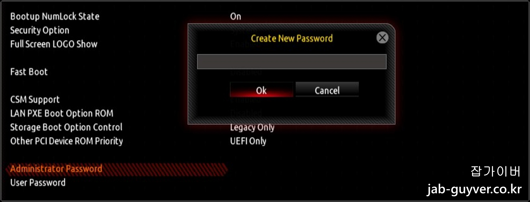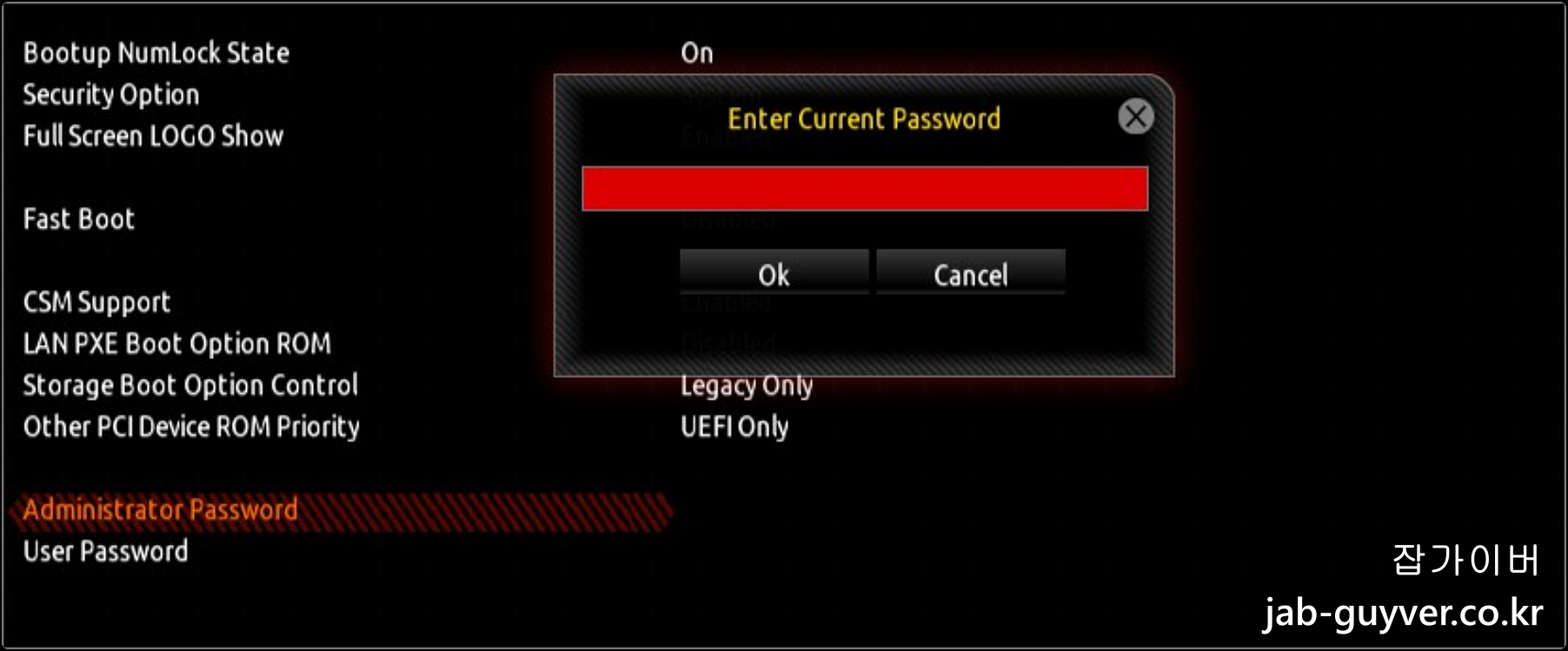 메인보드 설정 보안을 위한 현재 BIOS 암호 입력하며 이후 새 암호를 묻는 메시지가 나타나면 비밀번호 입력하지 않고 엔터를 눌러준 뒤 확인을 눌러주면 메인보드 부팅 비밀번호 삭제됩니다.