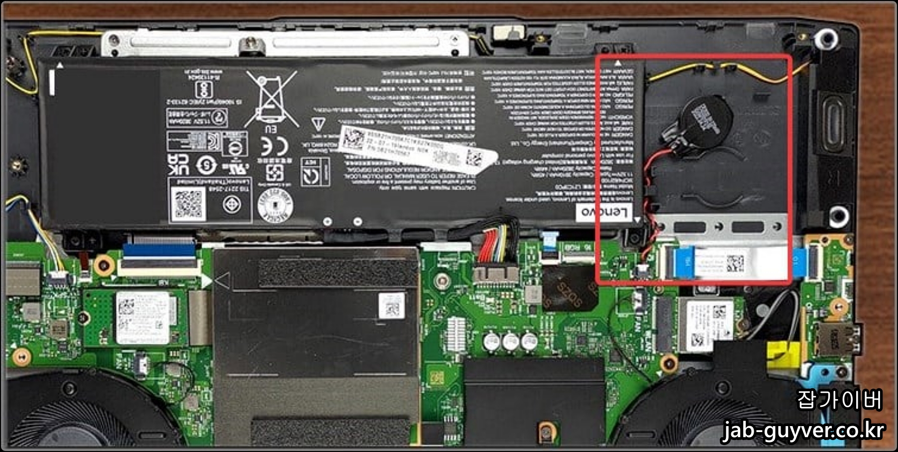 노트북 CMOS 배터리를 찾아서 분리하는데 노트북의 경우 이동 시 충격으로 배터리가 빠지지 않도록 메인보드 건전지 소켓 주위에 전기테이프등으로 감싸진 경우도 있으며 이 경우 테이프를 제거후 노트북 메인보드 배터리를 분리합니다.