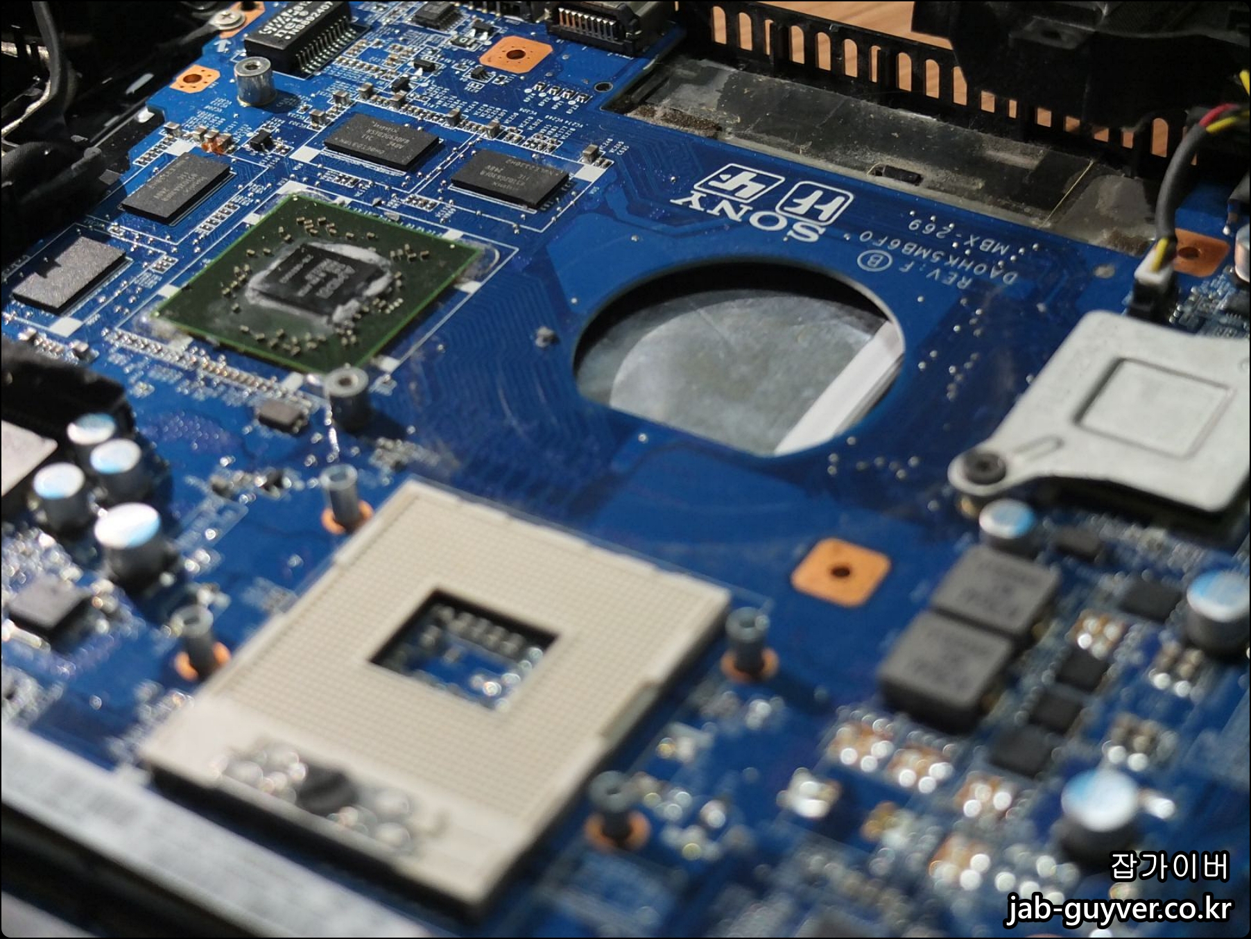 노트북 전원 버튼을 20초 정도 길게 눌러 노트북의 전원을 끈 뒤 노트북 후면 패널의 나사를 풀고 메인보드를 확인합니다