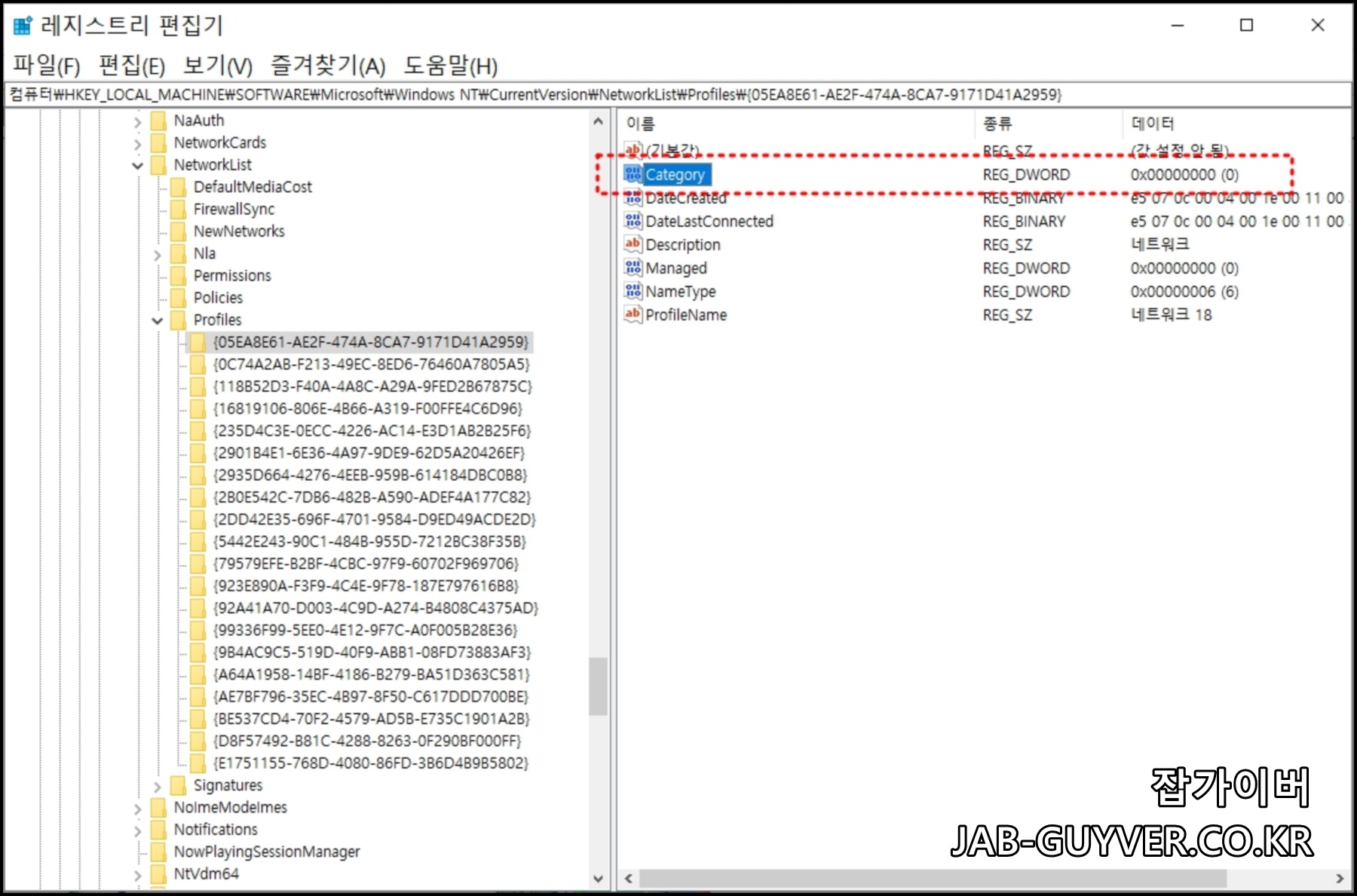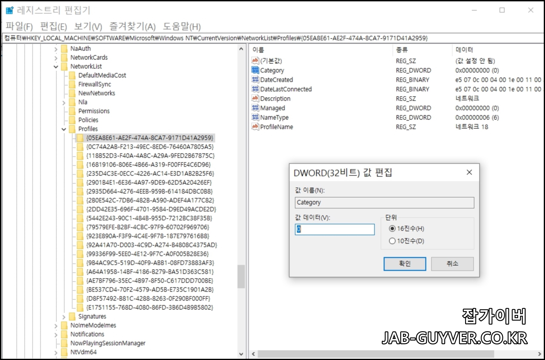 다음 Category 라는 DWORD 항목을 수정할 수 있으며 네트워크에 대해 설정하려는 프로필에 따라 값 데이터 필드에 이 값을 입력합니다.