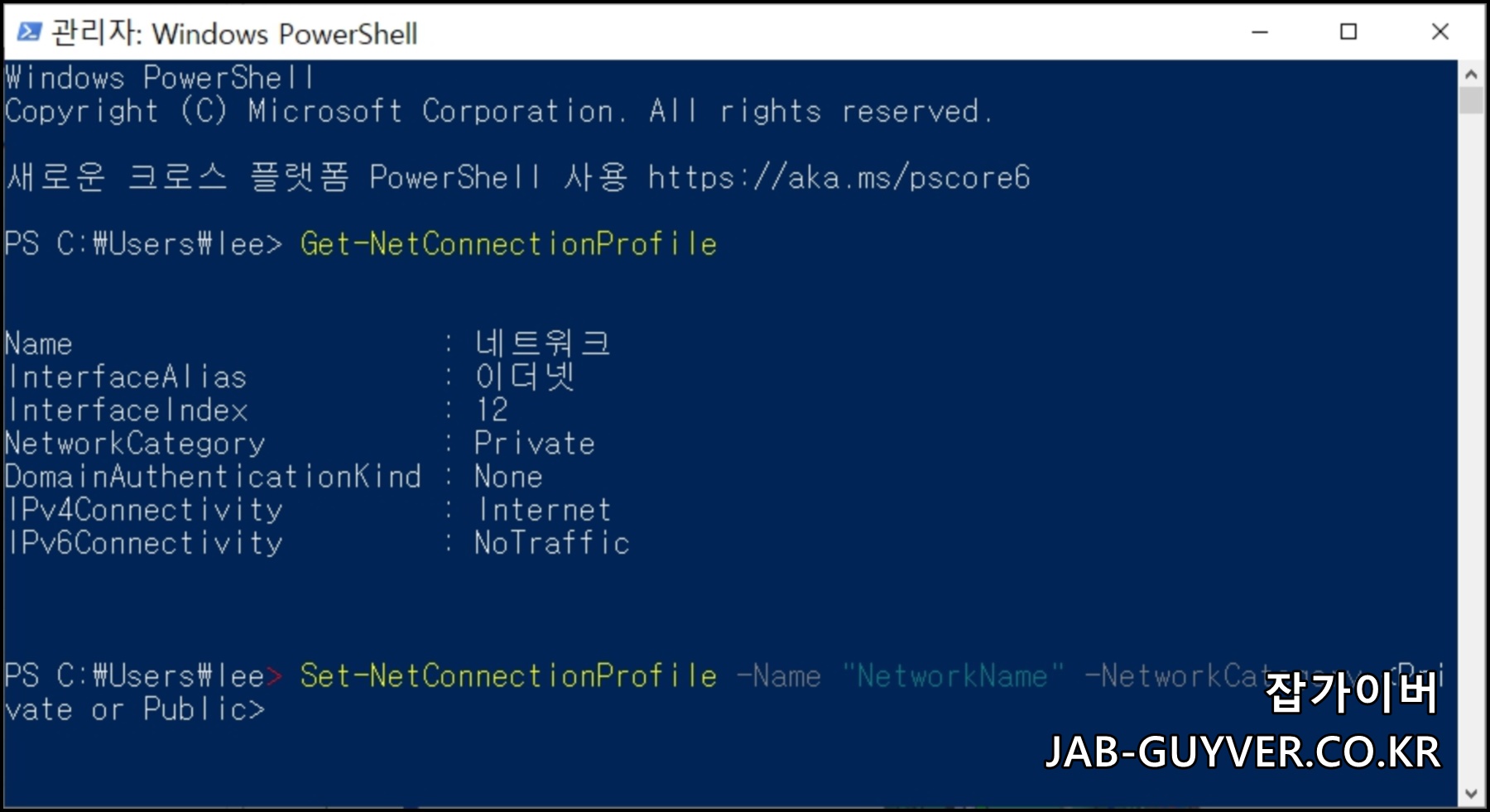 이때 네트워크 이름을 입력 하고 네트워크 범주를 개인 또는 공용으로 변경하며 이 단계에서 CMDLET 사용해 네트워크 프로필 변경된것을 다시한번 확인합니다.