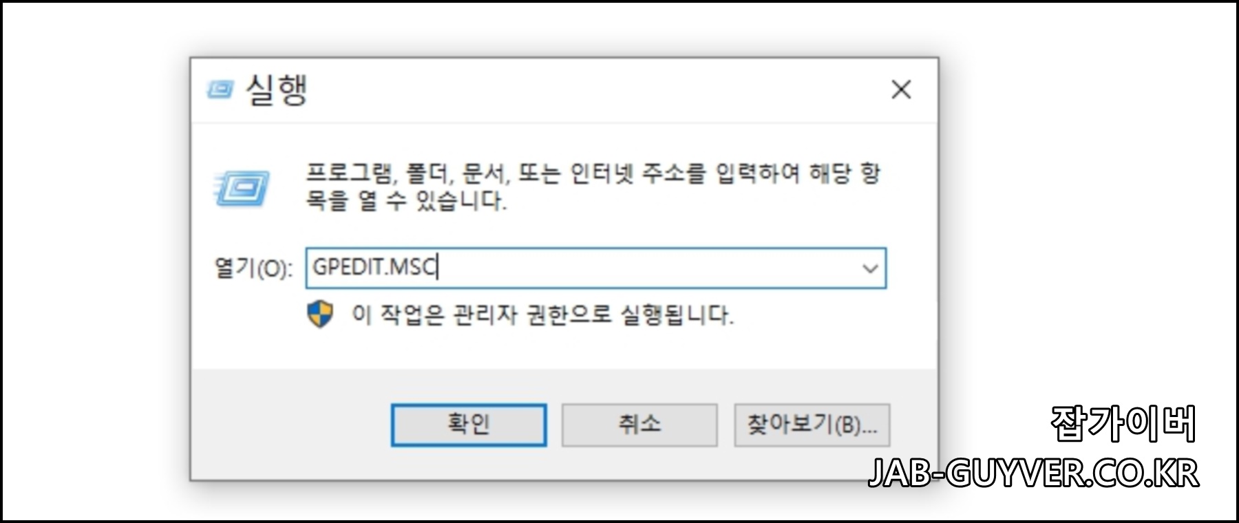 윈도우 키 + R을 눌러 gpedit.msc 입력 후 확인을 눌러주면 그룹정책 편집기가 실행됩니다.