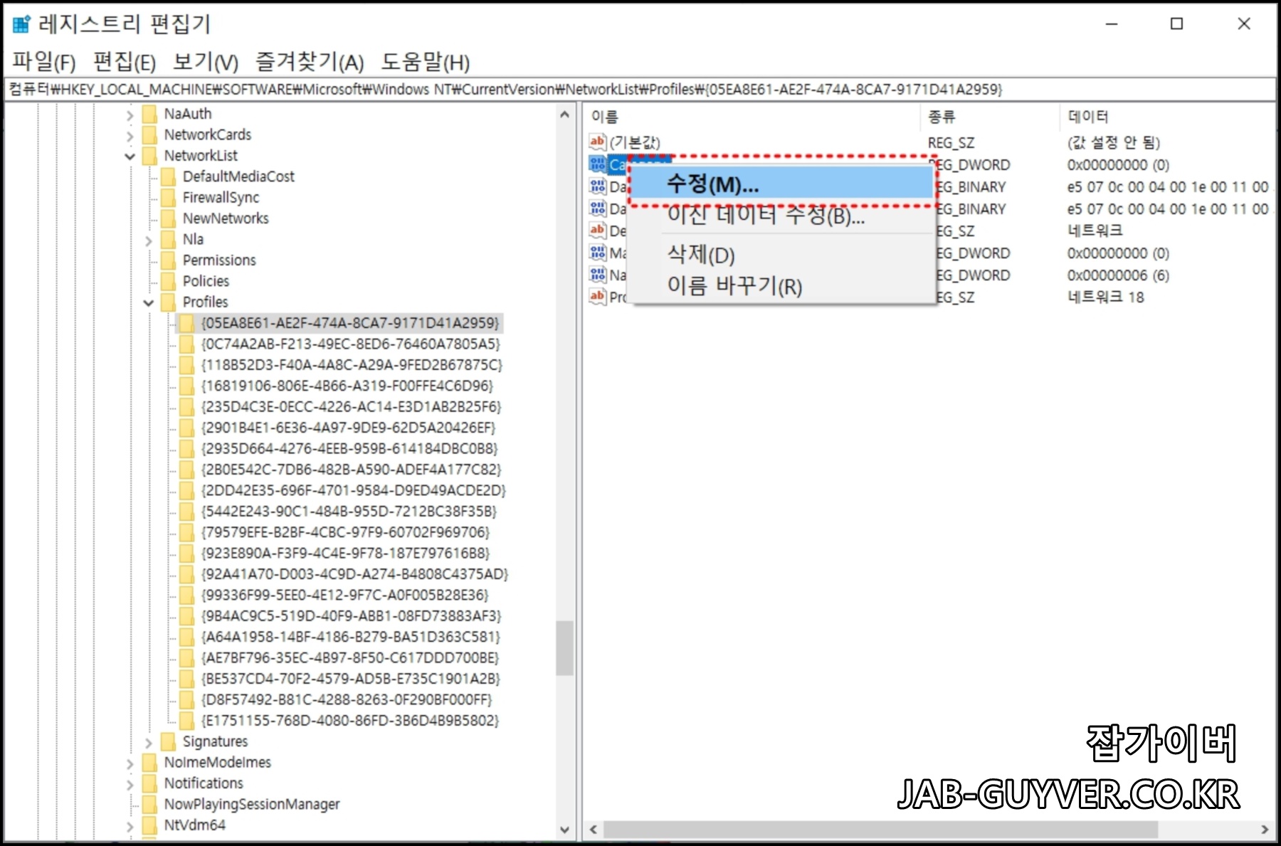이전 옵션이 작동하지 않는 경우 레지스트리 키를 수정하여 네트워크 프로필을 변경할 수 있으며 이 때 기존의 레지스트리 백업하느것이 중요합니다.