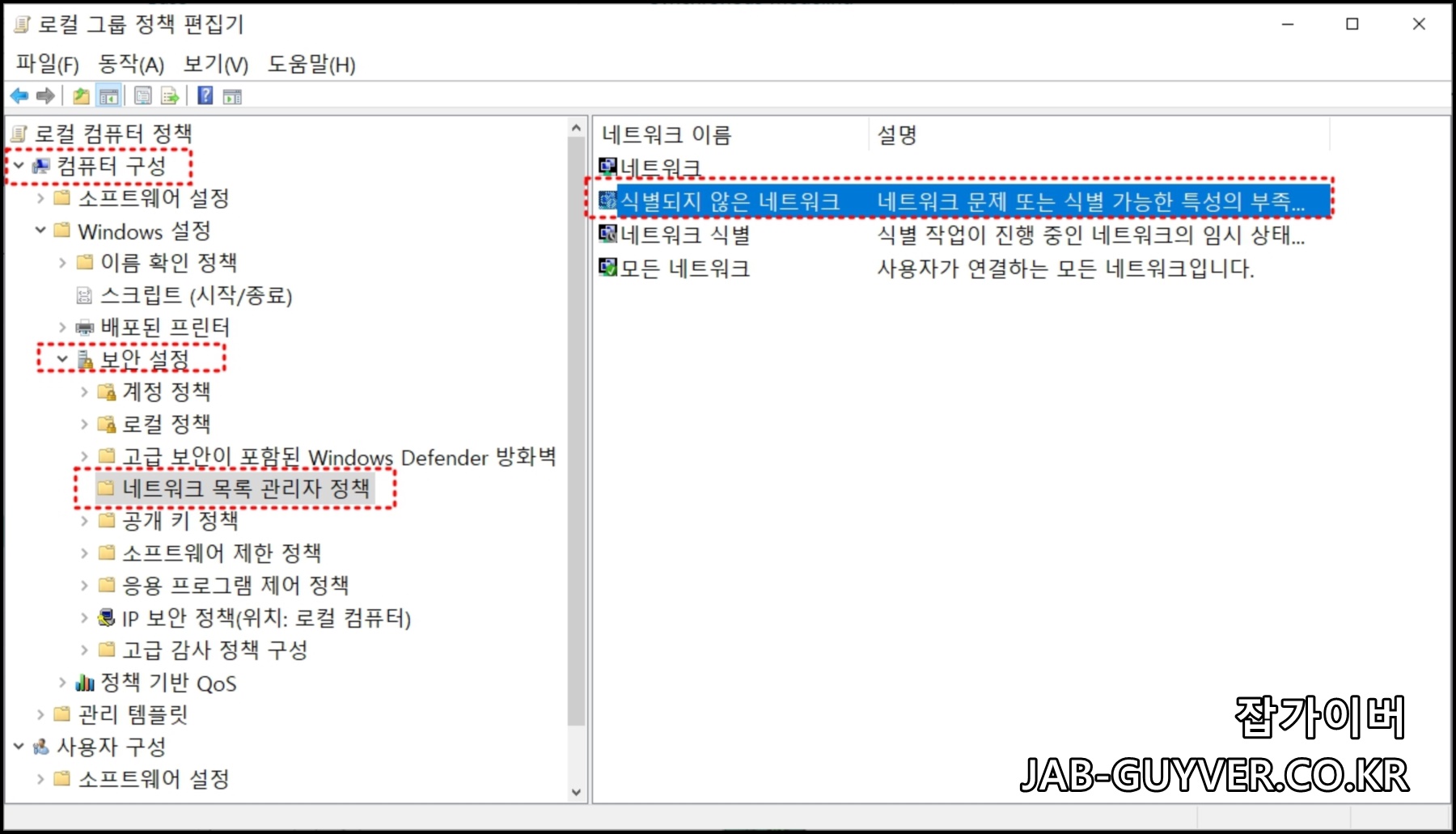 컴퓨터 구성 > Windows 설정 > 보안 설정 > 네트워크 목록 관리자 정책 으로 이동합니다.