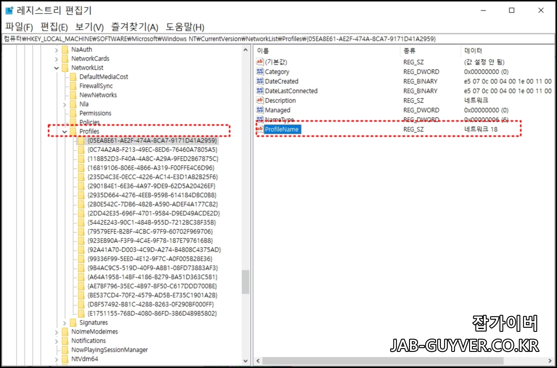 프로필을 변경하려는 네트워크의 하위 키를 클릭합니다. ProfileName 항목을 통해 네트워크 이름을 확인할 수 있습니다 .