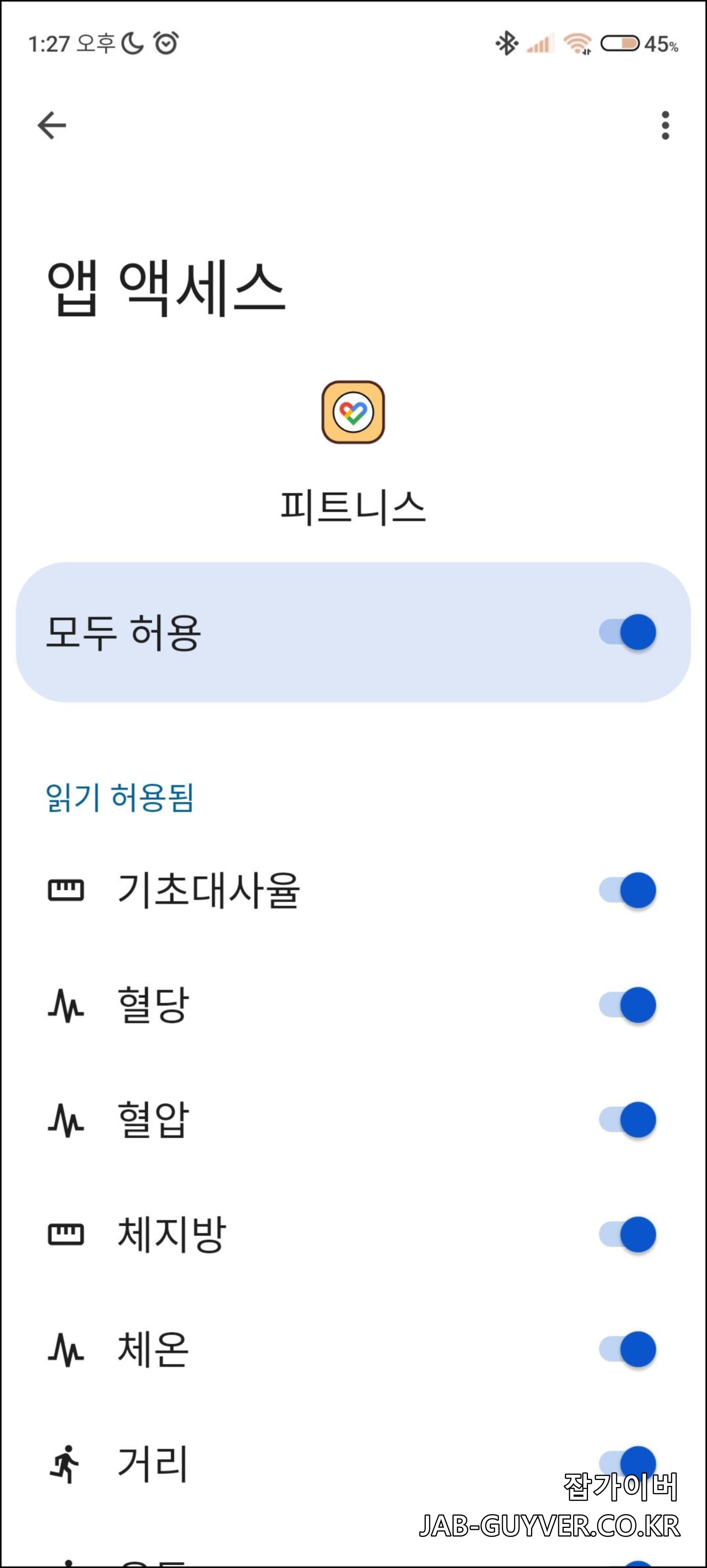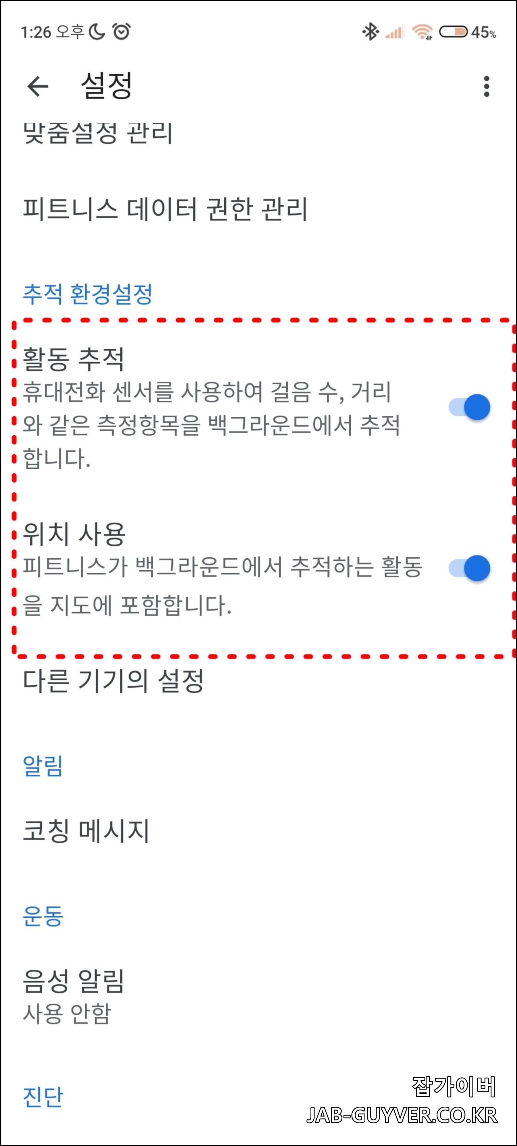 구글 피트니스의 운동 및 월경주기, 활동추적, 위치 GPS 정보를 활동에 허용해서 동기화할지 설정합니다.