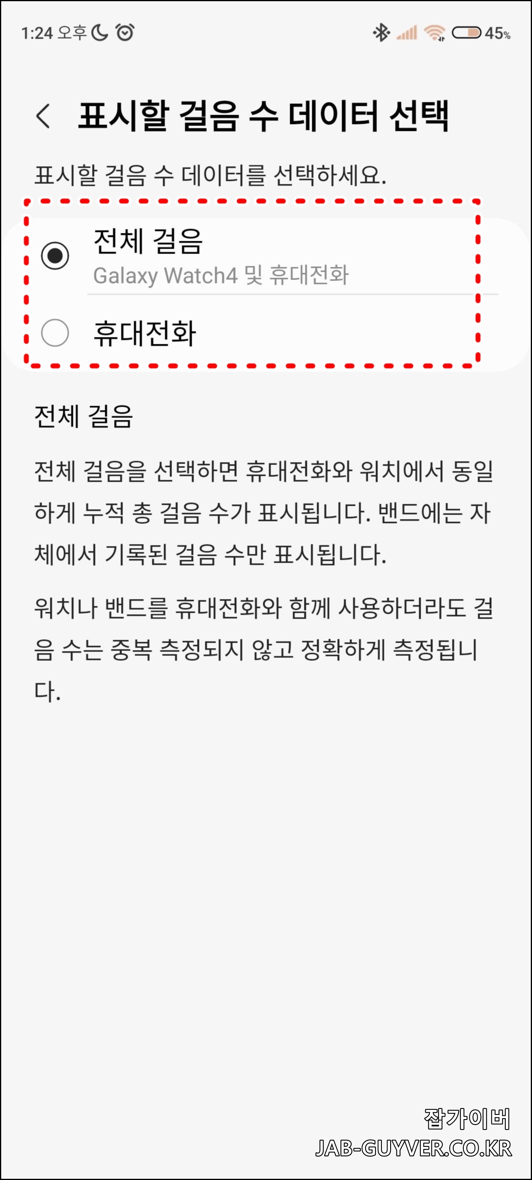 삼성헬스에 표시할 걸음수는 갤럭시워치를 통한 만보계 외에 휴대전화의 정보로 변경할 수 있습니다.