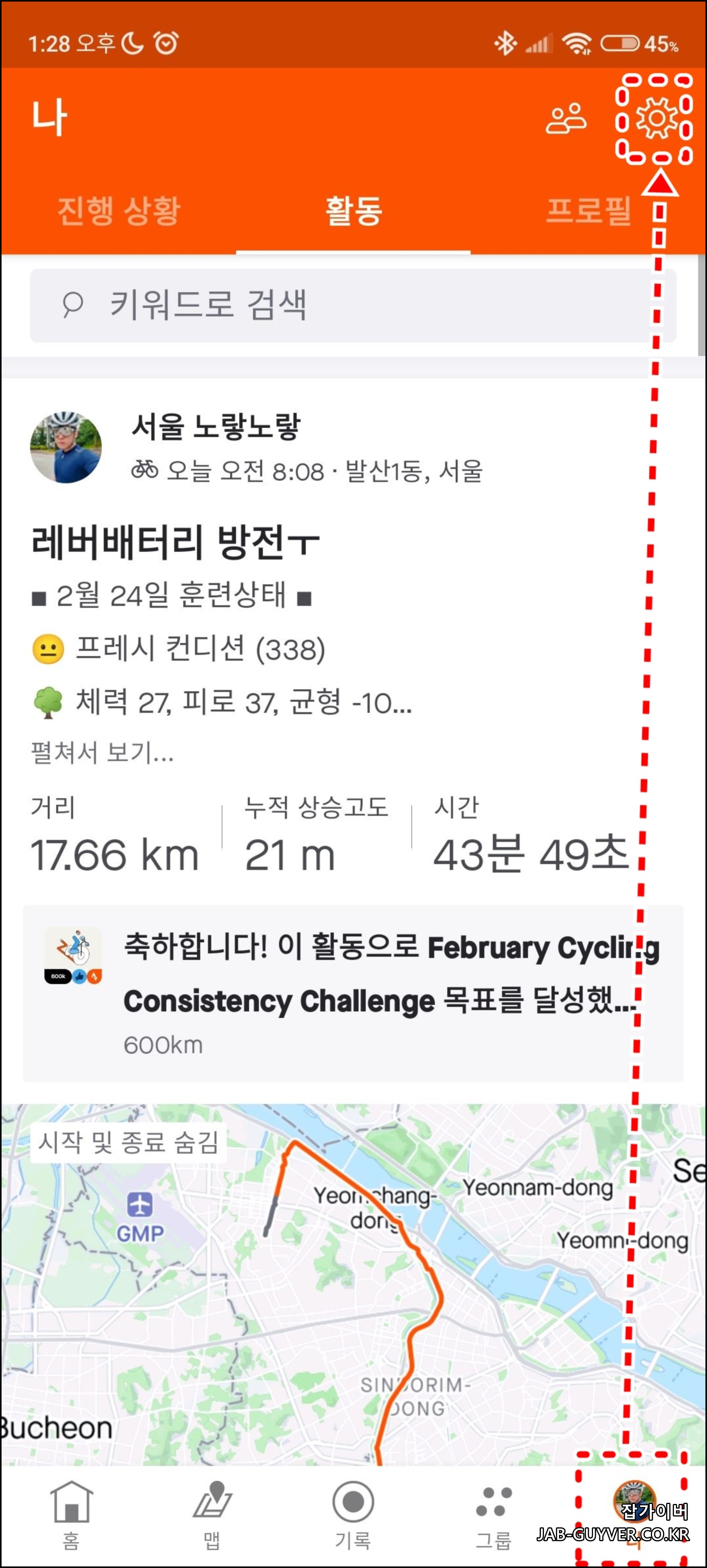 스트라바 앱을 실행 후 기어마크를 선택합니다.