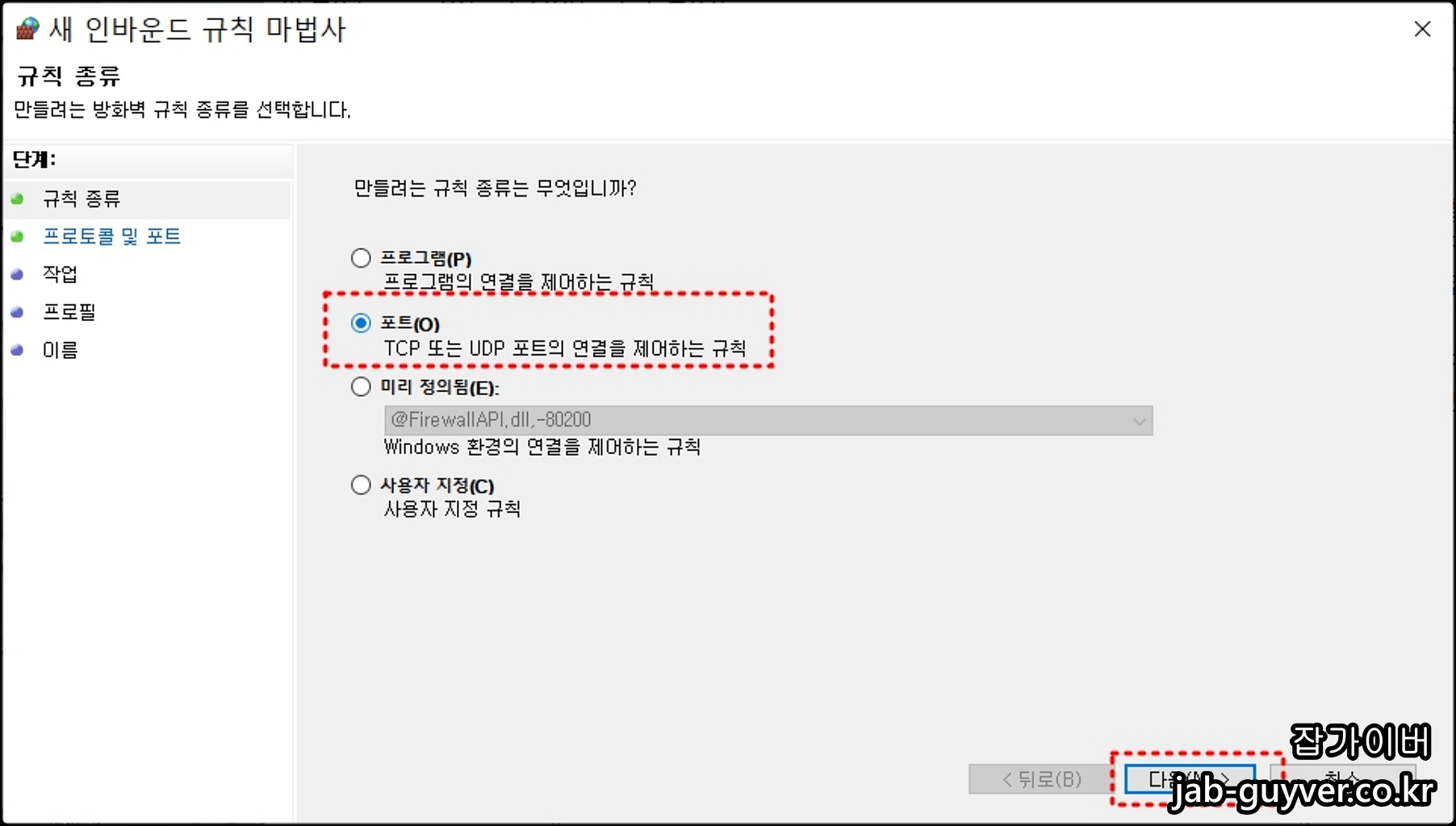 새규칙을 눌러 포트를 선택 TCP 또는 UDP 포트 연결을 설정합니다.