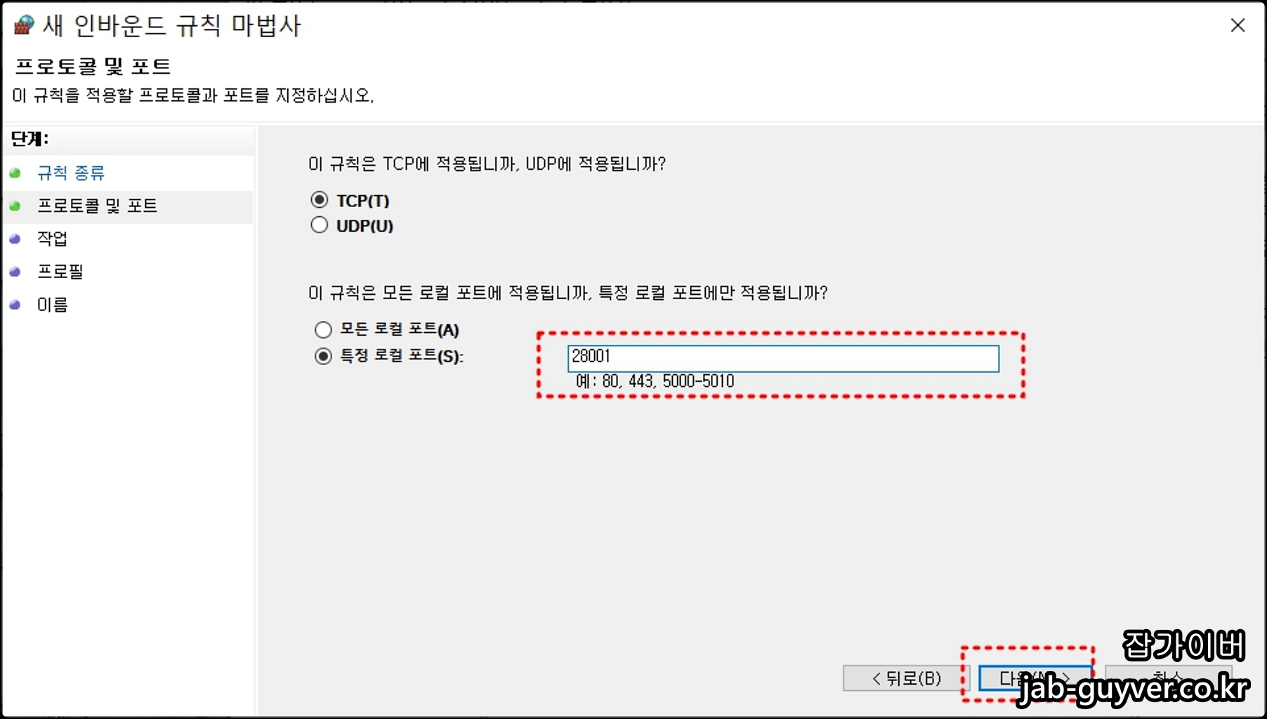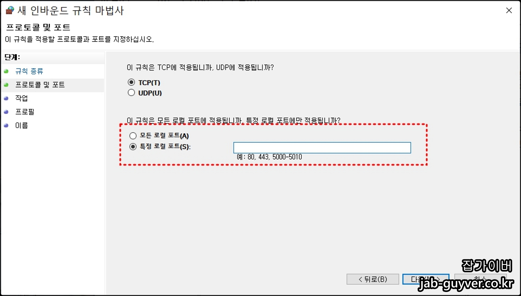 TCP / UDP 설정 후 원하는 포트번호를 입력합니다.