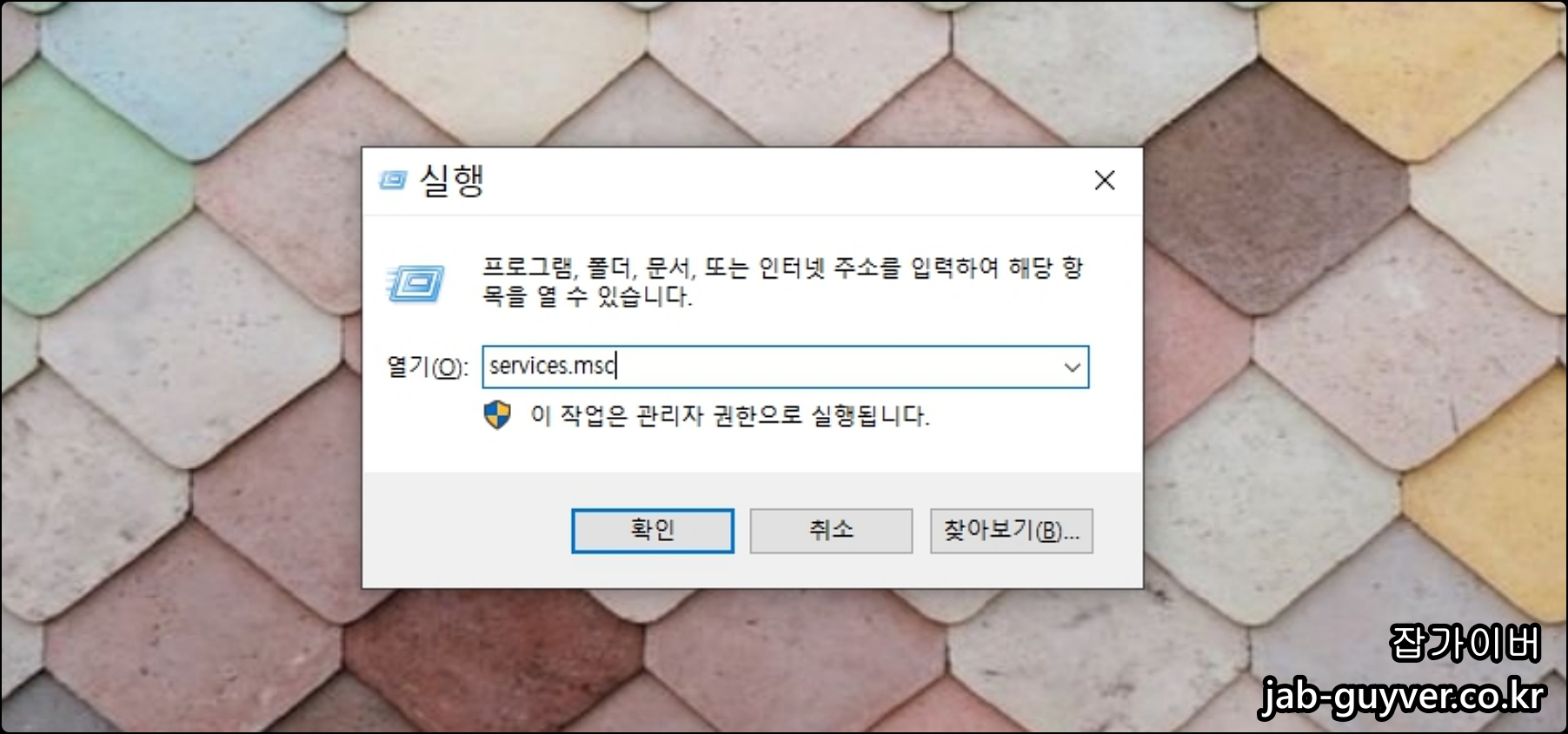 윈도우 키 + R을 눌러 Services.msc 입력 후 확인을 눌러 서비스를 실행합니다.