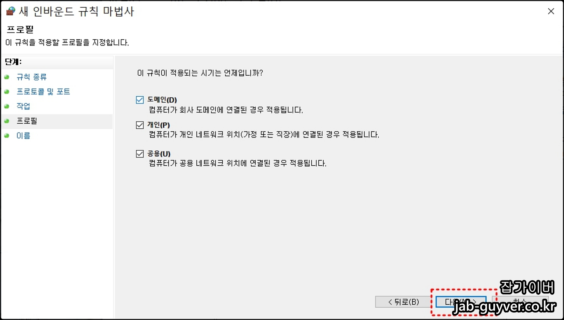 해당 인바운드 규칙에 대하여 규칙을 도메인 프로필, 개인프로필, 공용프로필 등 각각 네트워크 프로필에 대해 설정할 수 있습니다.