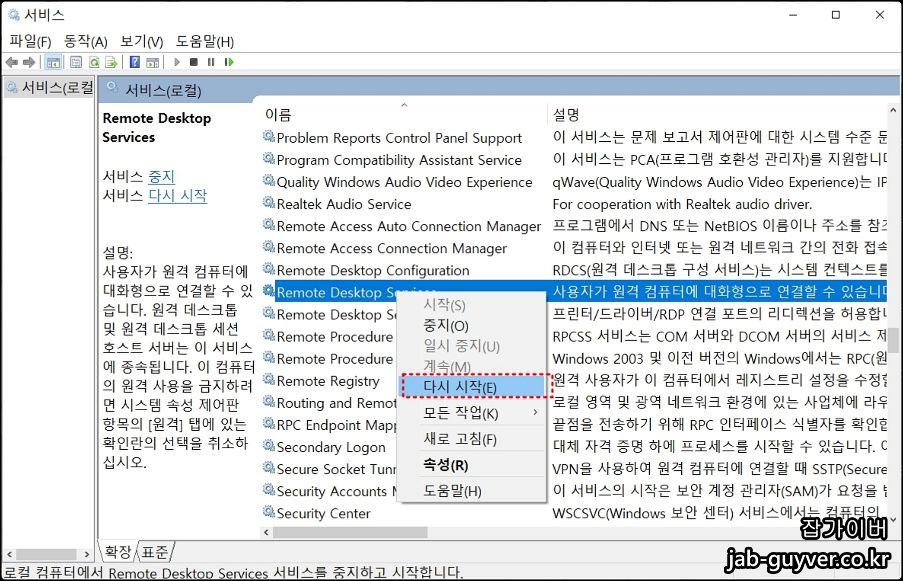 리모트 데스크탑 서비스를 다시 시작을 눌러줍니다.