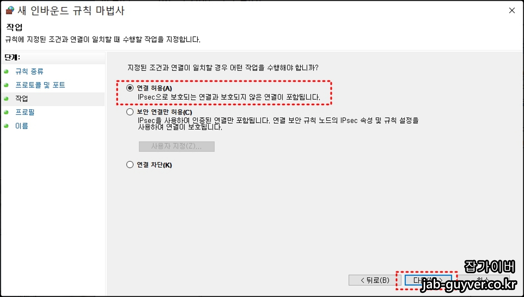 변경한 포트를 허용할려면 연결허용 / 반대로 포트를 차단하고 싶다면 연결차단을 선택합니다.