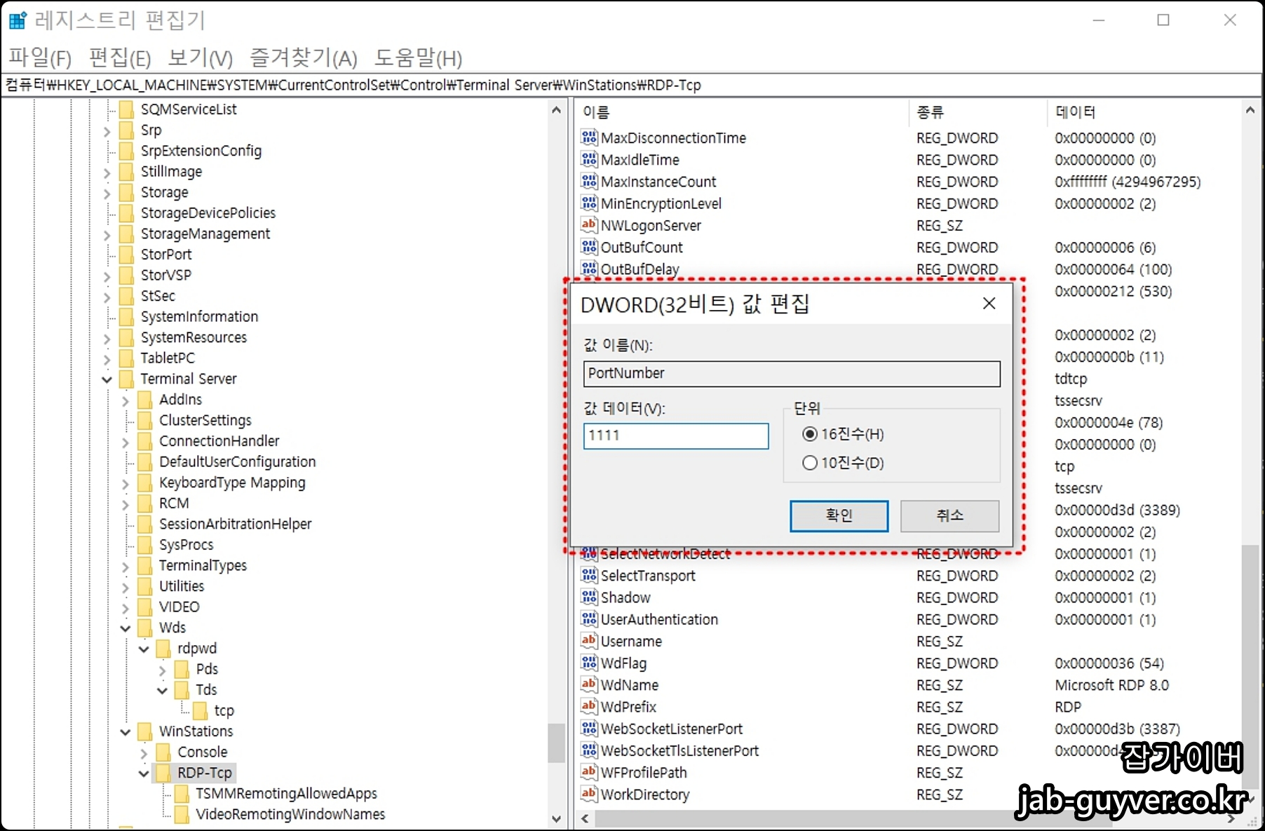 예를들어 기존의 3389 포트를 1111로 포트번호를 변경합니다.
